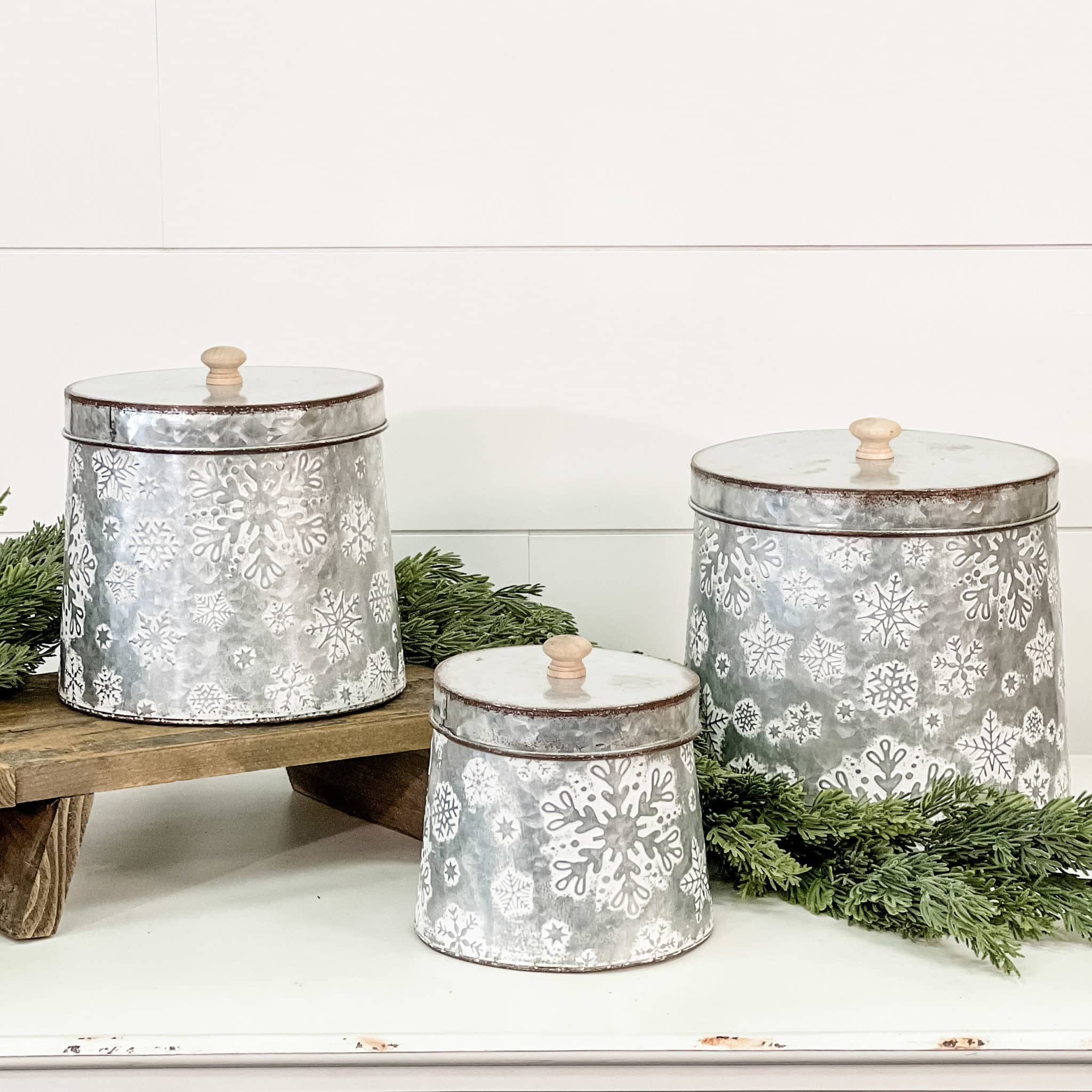 We are enthralled with these Snowflake Nesting Tins, featuring a lovely embossed galvanized look and nonstop practicality! (The fact that they store neatly together is a definite bonus!) From what we’ve seen, you love seasonal buckets and pails as much as we do, and currently one of our favorites is this eye-catching trio. The durable, long-lasting metal construction, whitewashed finish over floating snowflake design in neutral silver and white, offers a wonderful seasonal touch that can grace your home and offer organizational and decorating options all winter long.