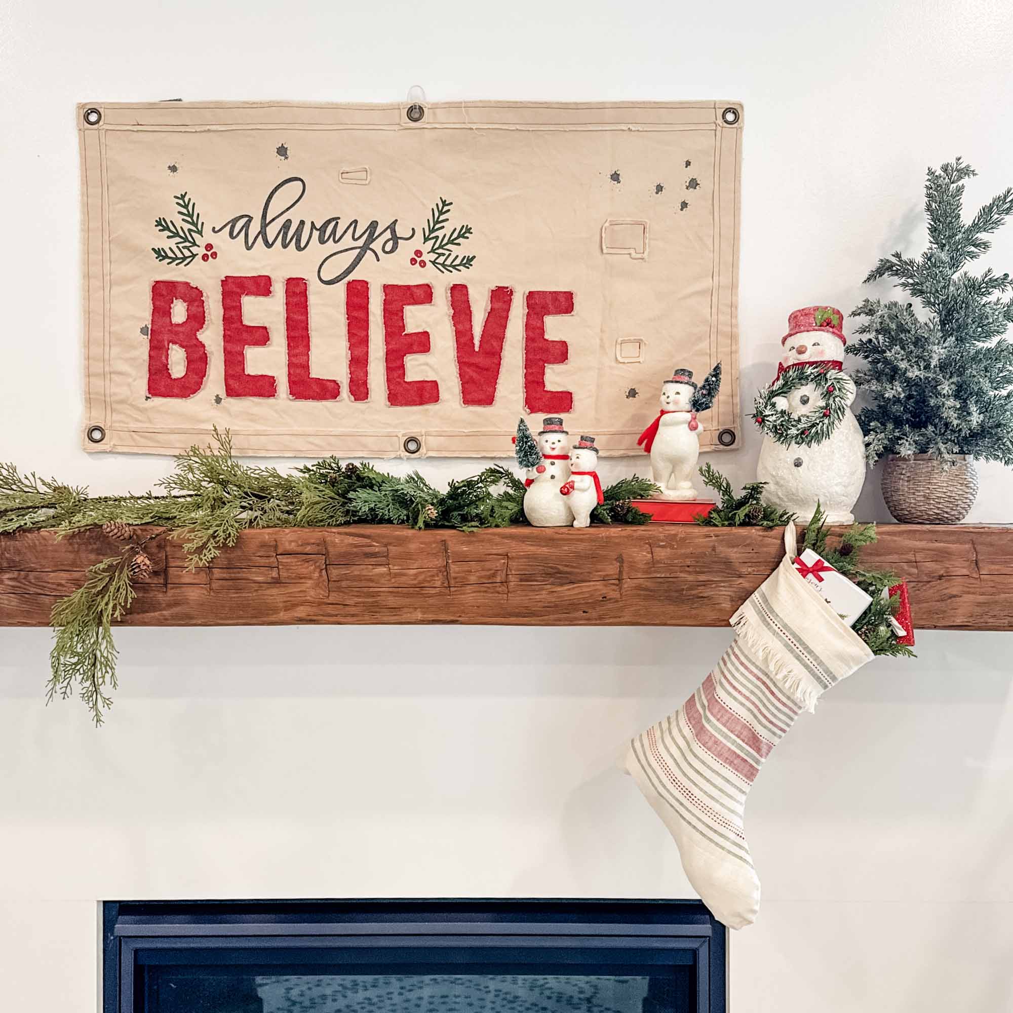 The Always Believe Wall Hanging brings a touch of rustic Christmas charm to your seasonal decor. Crafted from canvas, it showcases the heartfelt sentiment “Always Believe,” with the word Always in flowing green script framed by evergreen sprigs, and Believe boldly displayed in distressed red block letters. Decorative patches, paint splatter accents, and raw, unfinished edges add a primitive, handmade feel. Finished with sturdy metal grommets for easy hanging, this banner makes a statement whether displayed on a wall, door, or mantel, reminding everyone of the timeless magic of the season.
