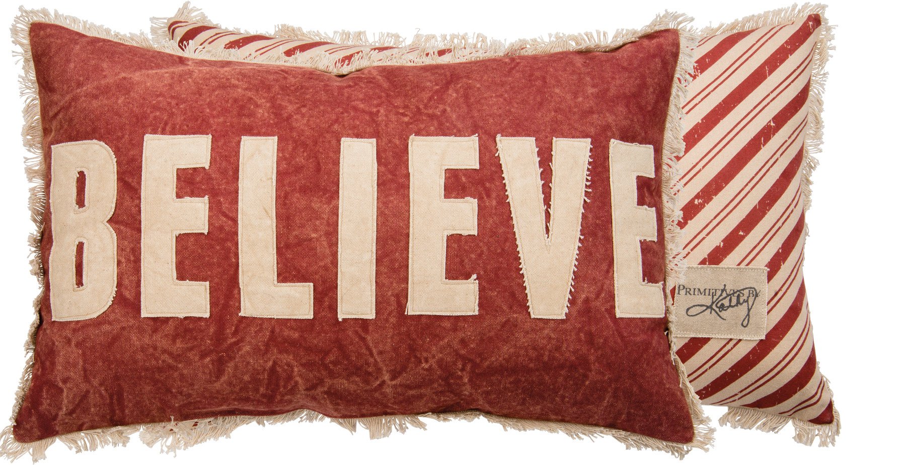 Bring a touch of old-fashioned holiday charm to your home with the Believe in Christmas Pillow. Measuring 14″ x 22″, this double-sided canvas pillow features a bold appliqued “Believe” sentiment on one side and a festive diagonal candy stripe print on the other. Finished with a rustic fringe edge, it offers a cozy primitive look that feels straight from a vintage Christmas. The soft polyester filling adds comfort and support, while the zippered cover allows for easy removal and cleaning. Shipped vacuum-sealed for protection and easy storage, this pillow makes a cheerful accent for sofas, beds, or entryway benches.