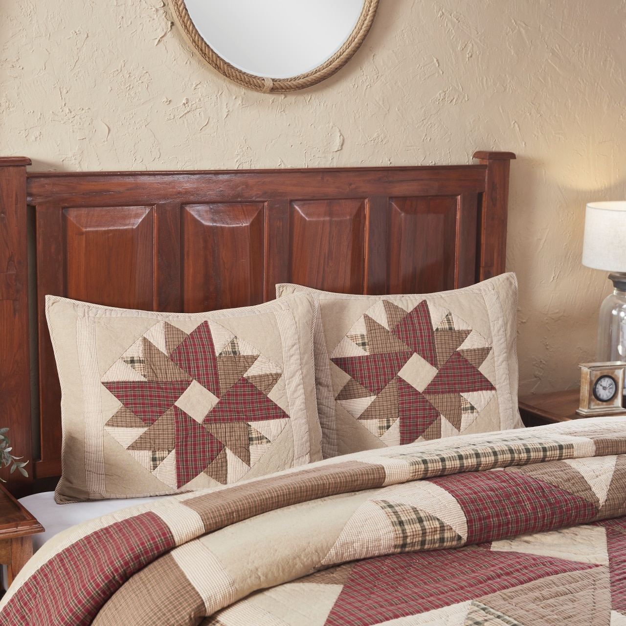 Instantly transform your bedroom with the Cider Mill Sham. Rich and beautiful red, green, khaki, along with light taupe and brown colors add a primitive element to your country setting while coordinating with your decor. Cotton and batting are layered, then sewn together using stitch in the ditch quilting, and the straight edges, and unique button closures complete the look for a classic country approach with a touch of primitive appeal. Reverses to coordinating plaid fabric. Shams fit a King-size pillow.
