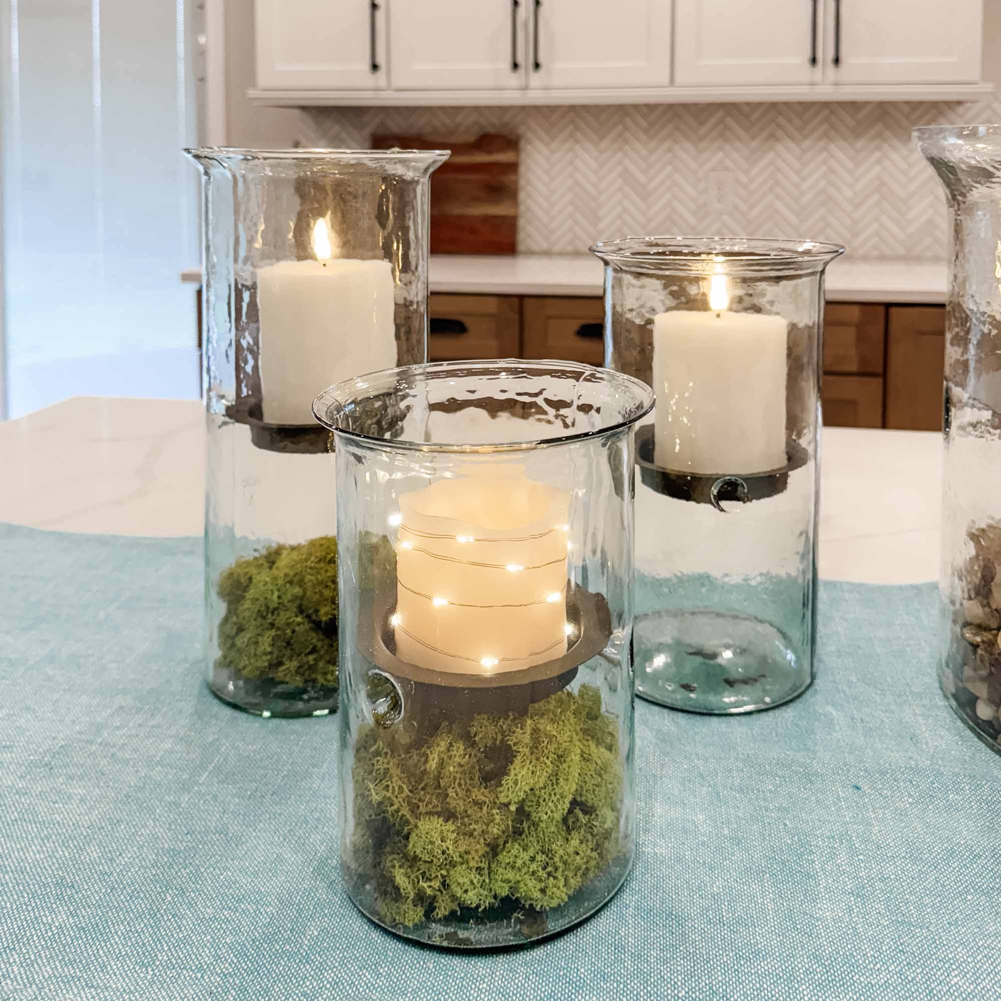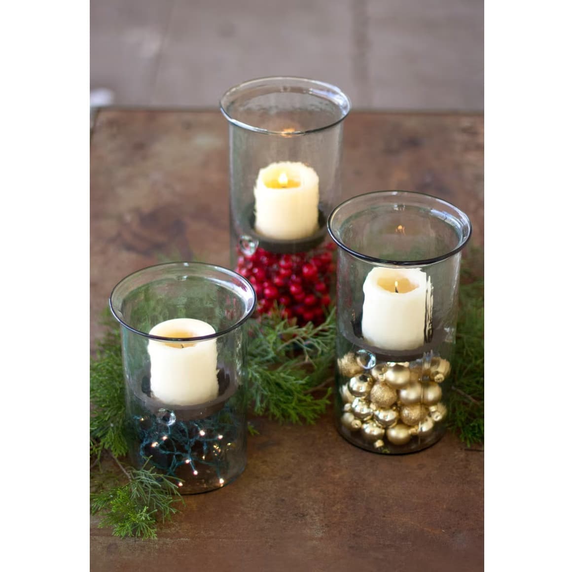The Classic Fillable Hurricane is sold in a set of two and are versatile pieces that brings both charm and creativity to your decor. Handcrafted and mouth-blown by skilled artisans in Colombia, each hammered glass cylinder features a rustic iron insert designed to hold a 3″ pillar candle. The clear, textured glass adds a touch of artisan appeal, while the removable metal cup makes it easy to switch out candles or refresh the contents below.