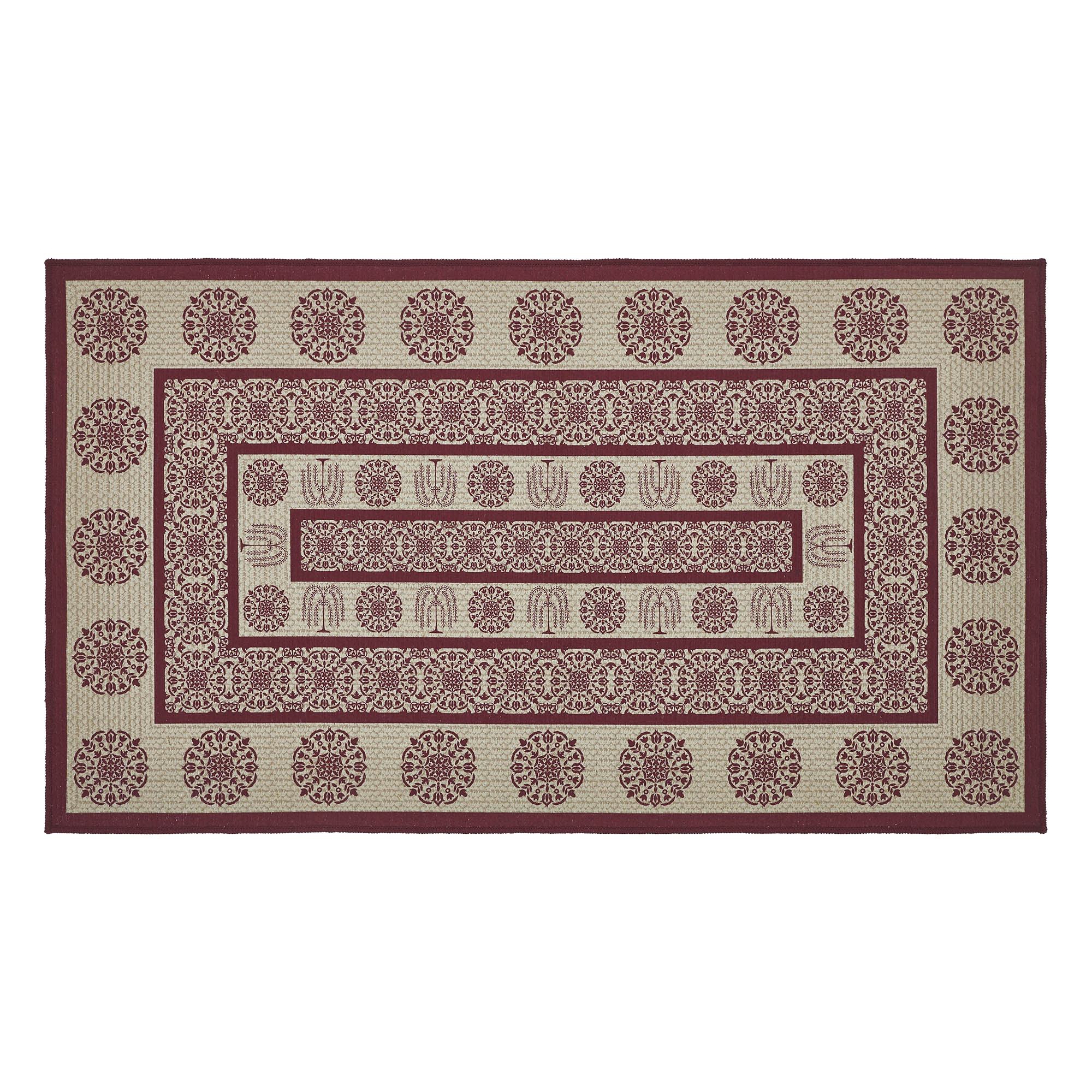 Enhance the beauty of your living space with the Custom House Burgundy Tan Jacquard Indoor/Outdoor Rug, a delightful addition to your home decor. This woven rectangular polyester rug seamlessly blends Primitive and Country design elements, offering a captivating medallion and willow tree print that adds a touch of classic charm to your floor decor. Perfect for high-traffic areas, these rugs are crafted from a high-quality polyester allowing for easy maintenance and lasting durability that will withstand the test of time. The no-slip latex backing keeps the rug where you place it.  Whether you place it indoors or outdoors, the deep Burgundy and tan hue exudes sophistication enhancing your indoor or outdoor spaces, making it an excellent choice for elevating your floor decor.