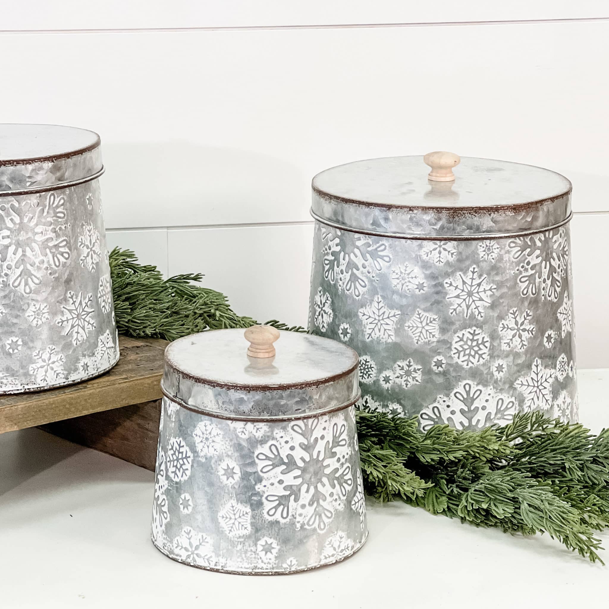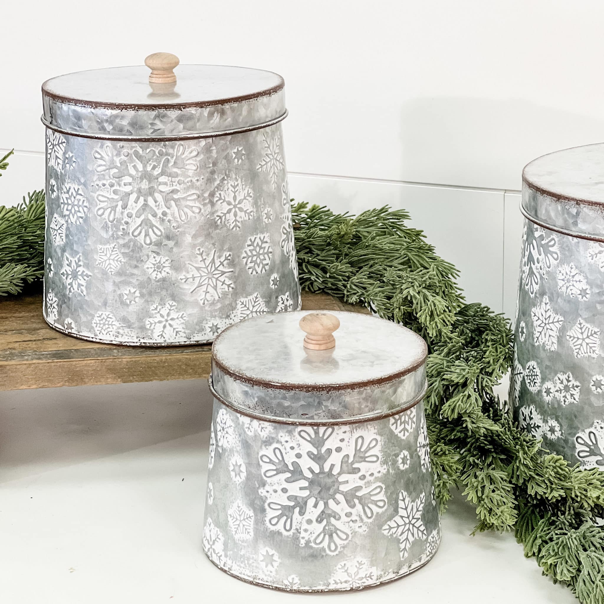 We just have to come clean… We’ll never tire of decorating with bins, tins or buckets, no matter what the season. They’re just so easy to put to work in your updated home and these Snowflake Nesting Tins, with their shiny silver galvanized metal, add a certain old-fashioned cottage appeal with a whitewash finish that accentuates the snowflake designs. Repeating snowflakes of different shapes and sizes are imprinted into the tin, adding a delightful sense of movement and textures that are visually appealing. All three tins have lids that have a slightly-aged appearance with brushed brown touches on the edges. The lids are capped off with small wooden toppers for easy access. Tins nest neatly together when not in use, for easy storage. Tins are wider at the bottom than at the top. Not for food use. Set/3.