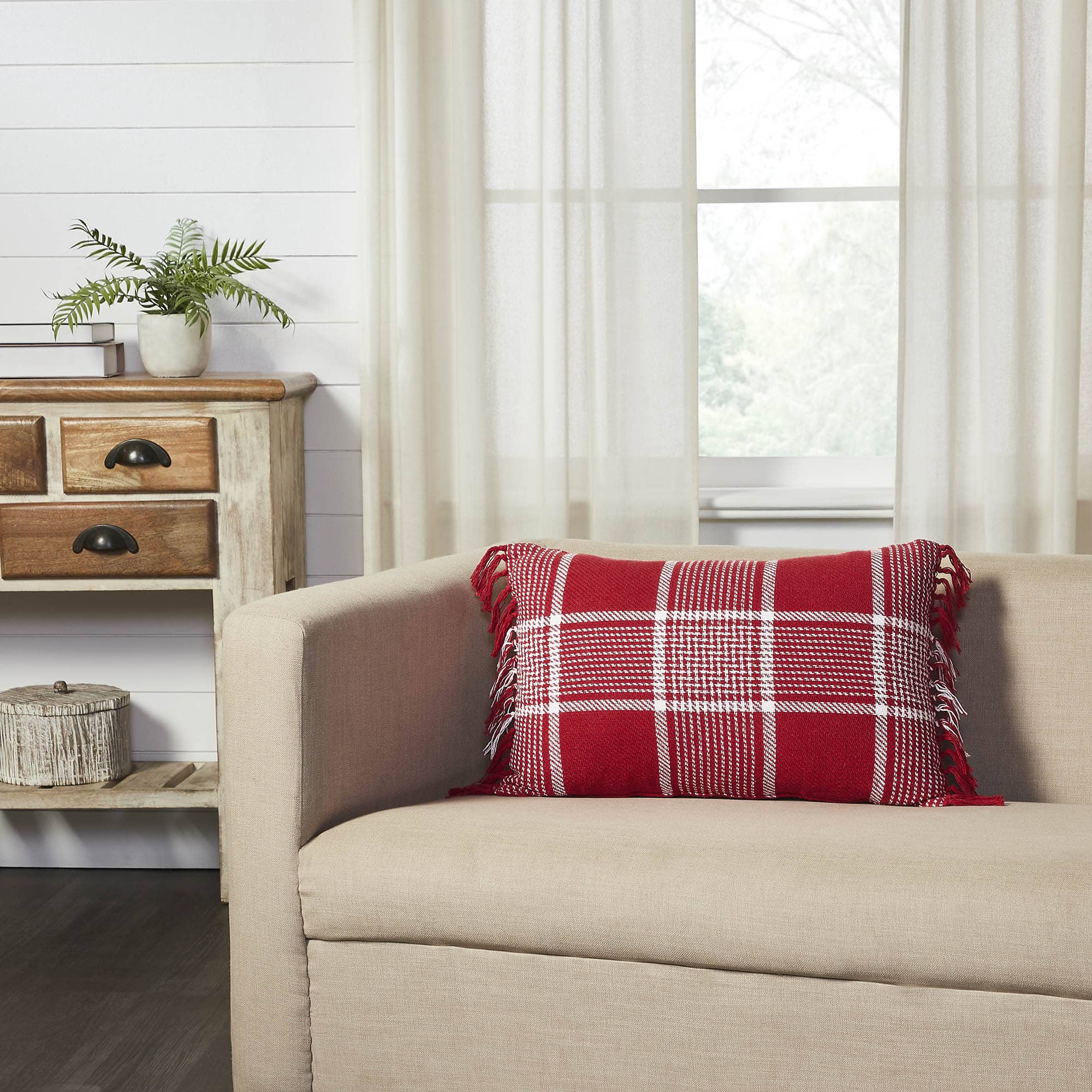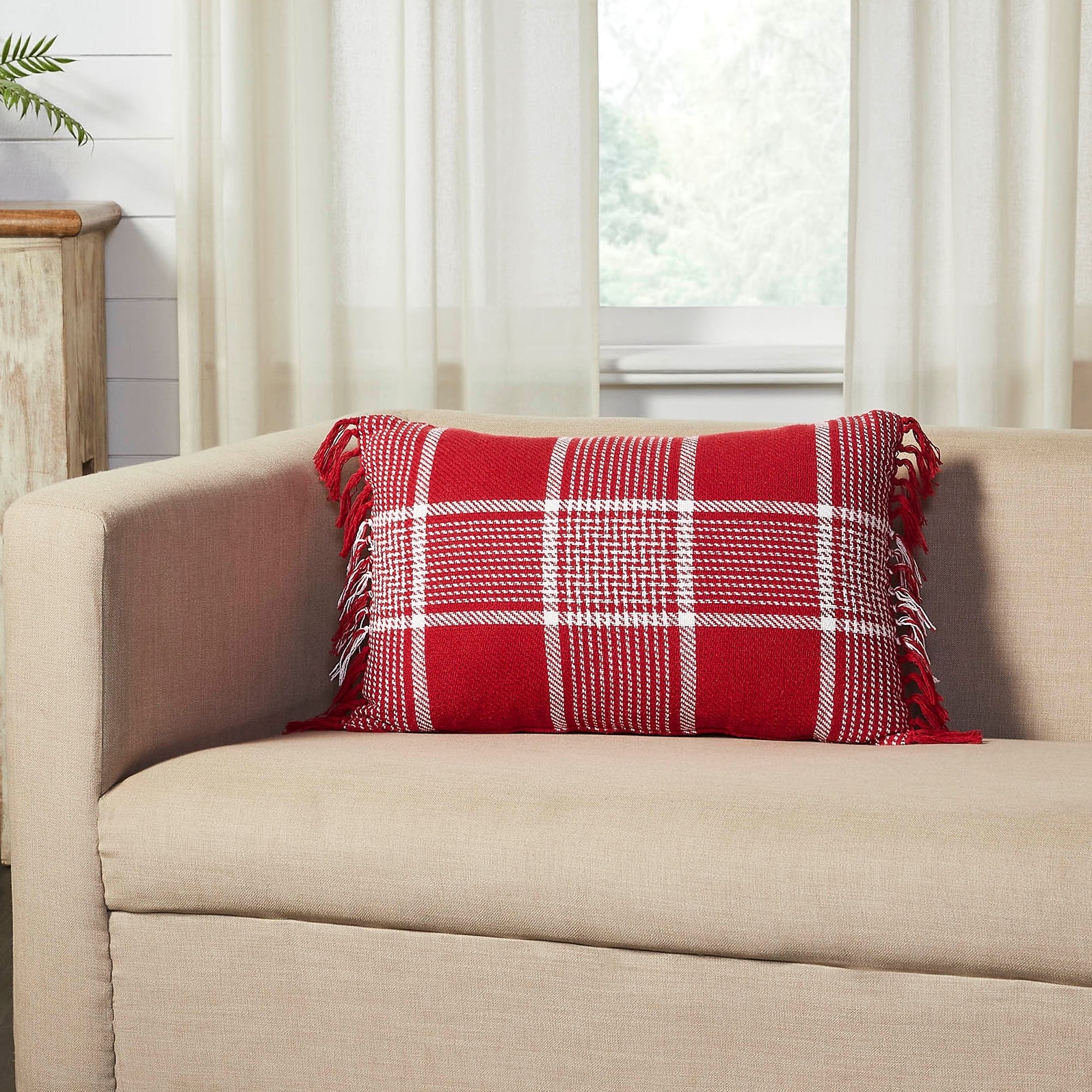 Add a pop of sophisticated seasonal style with the Eston Red White Plaid Pillow. Measuring 14″ x 22″, this charming accent pillow blends classic holiday colors with a fresh farmhouse feel. A bold red base is accented with crisp white striping in a timeless plaid design, creating just the right balance of festive cheer and understated elegance. Regularly spaced tassels along the edges add playful texture and a unique touch, while the reversible design—finished in a simple solid red—offers versatile styling for the season.