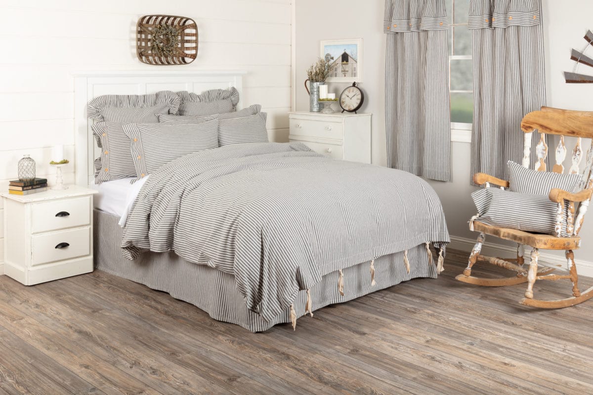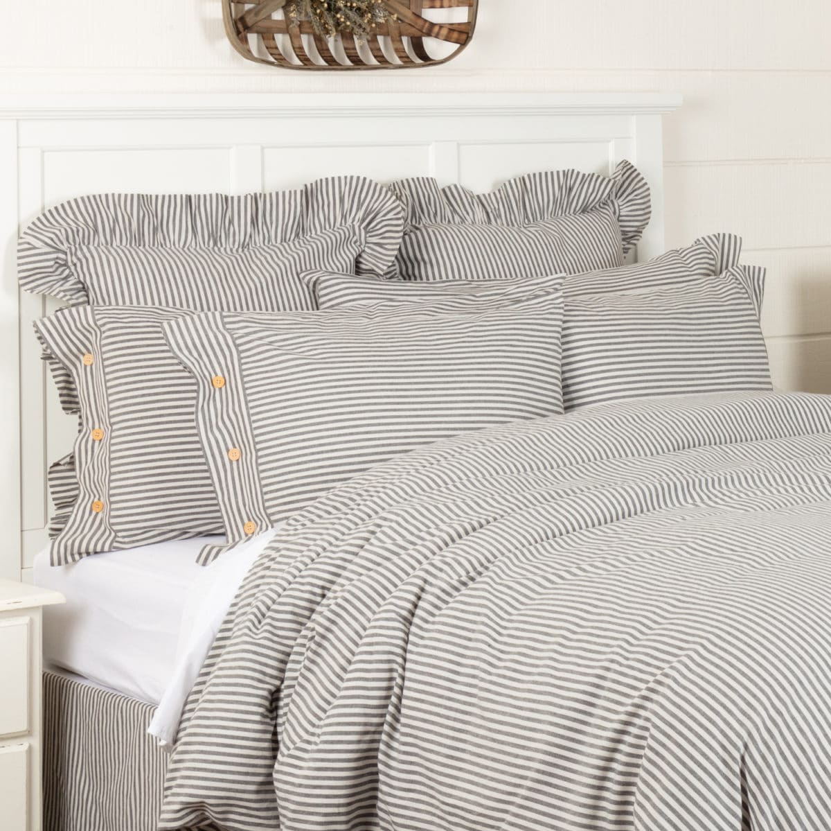 Ticking fabric is a real mainstay in home design, featuring a look that remains crisp, current and trendy, even though it’s been around for hundreds of years! How many products can you say that about! This tightly woven, hard-working fabric was originally used to cover mattresses, designed to keep quills & feathers from poking through the fabric. Our Farmhouse Ticking Gray Duvet Covers are made of 100% cotton.