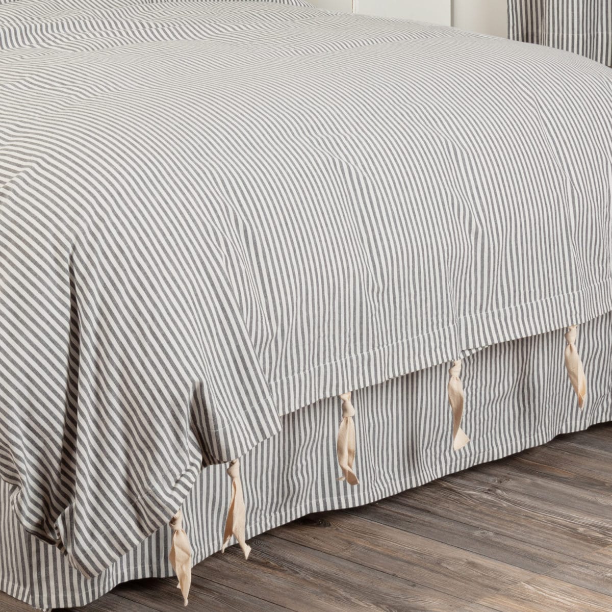The Farmhouse Ticking Grey Collection is available exclusively at Piper Classics. The Duvet Cover features a woven charcoal grey ticking stripe on an antique white base. Duvet Cover reverses to same fabric and twill tape ties on each inside corner to secure duvet insert. The open side of the cover features twill tape ties and button closures to keep comforter secure. The sharp turned, knife edge keeps Farmhouse Ticking fabric looking crisp and tidy. Ever-popular and classic this cloth continues to remain fresh and up-to-date, coordinating effortlessly with other fabric collections for a mix-and-match look.