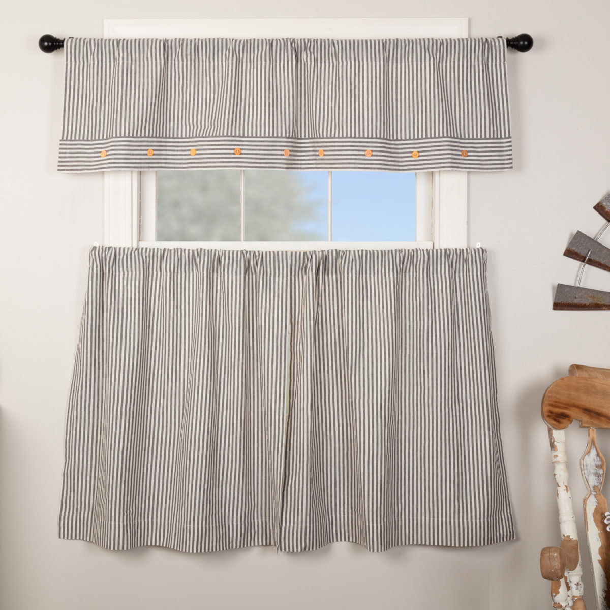 Our customers love our Farmhouse Ticking collection but we’ve had a lot of requests for gray. You asked, we listened and we know you’ll love this new color! Gray ticking is the perfect addition to your modern farmhouse decor. The Lined Tiers feature a woven charcoal grey ticking stripe on an antique white base. Tiers provide added privacy or coverage and are the perfect complement to our valances and swags. The ever-popular, classic fabric remains fresh and up-to-date, coordinating effortlessly with other fabric collections for a mix-and-match look.
