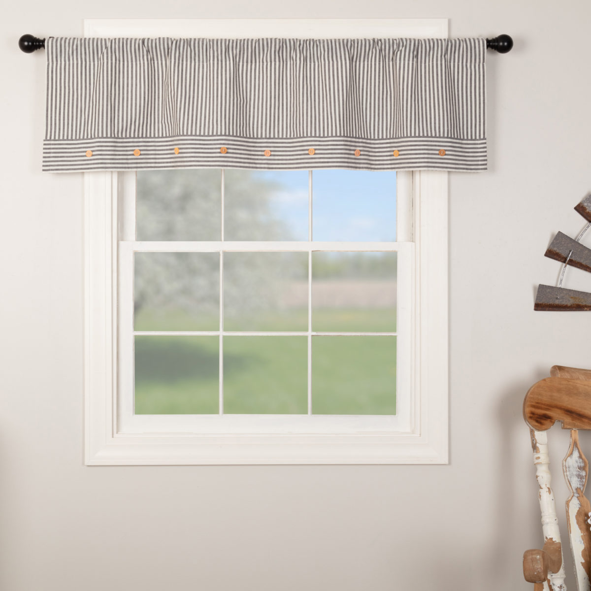 Gray ticking is the perfect addition to your modern farmhouse decor. The Lined Valance features a woven charcoal grey ticking stripe on an antique white base. Valance is given added dimension and interest with the horizontal ticking accent along the bottom of fabric, accented with 9 wooden buttons. The ever-popular, classic fabric remains fresh and up-to-date, coordinating effortlessly with other fabric collections for a mix-and-match look.