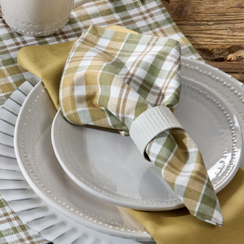 The Farmstead Napkin adds a traditional, homespun touch to your table with a classic plaid pattern in warm gold, soft white, and soft sage green. Made from 100% cotton in a smooth, flat weave, this fabric has a soft, natural feel and a clean finish—perfect for both casual meals and more polished gatherings.