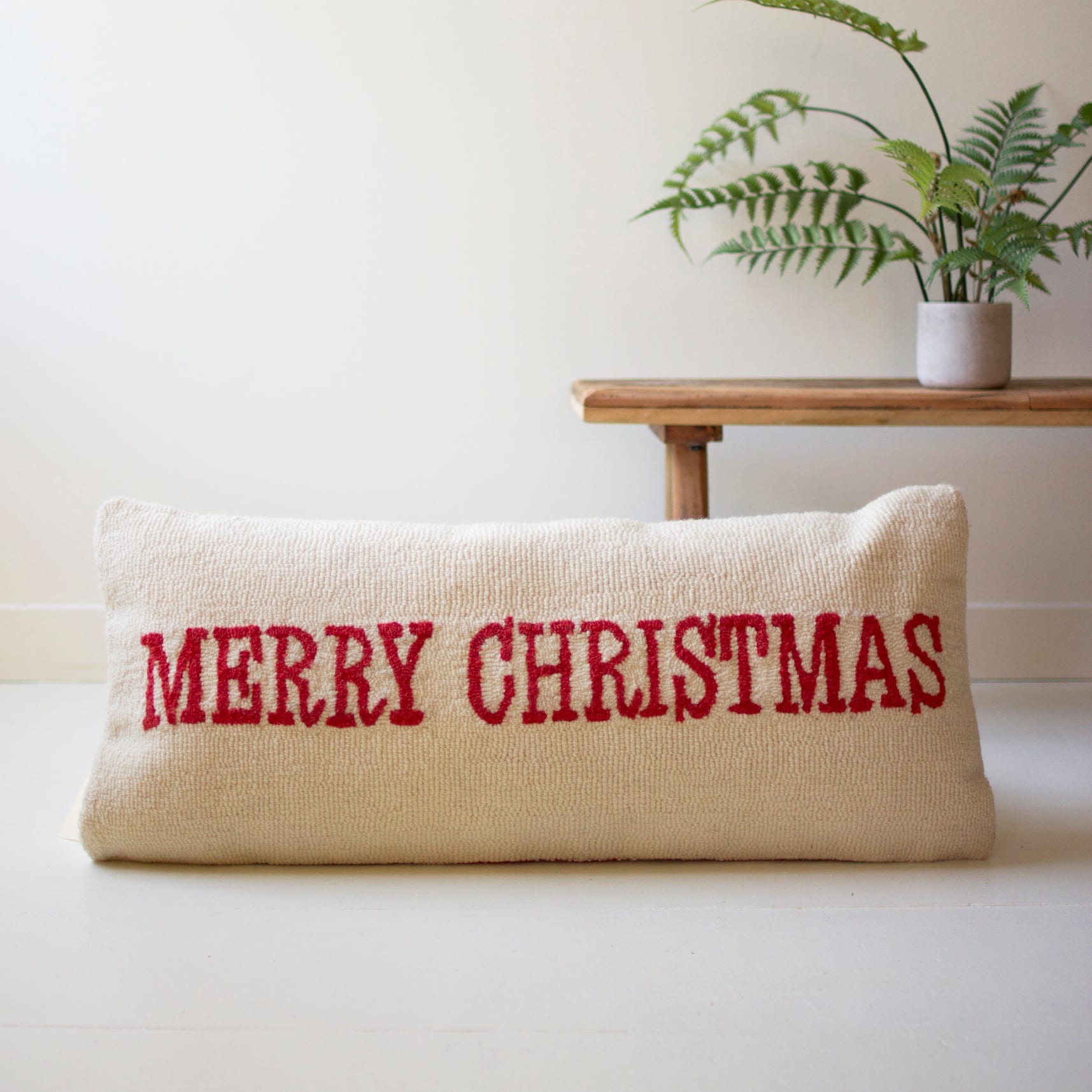 The natural-colored background elegantly frames the bold red “Merry Christmas” text, and the red piping trim gives it a polished, tailored finish. Complete with a removable insert and zipper closure, it’s as practical as it is beautiful.