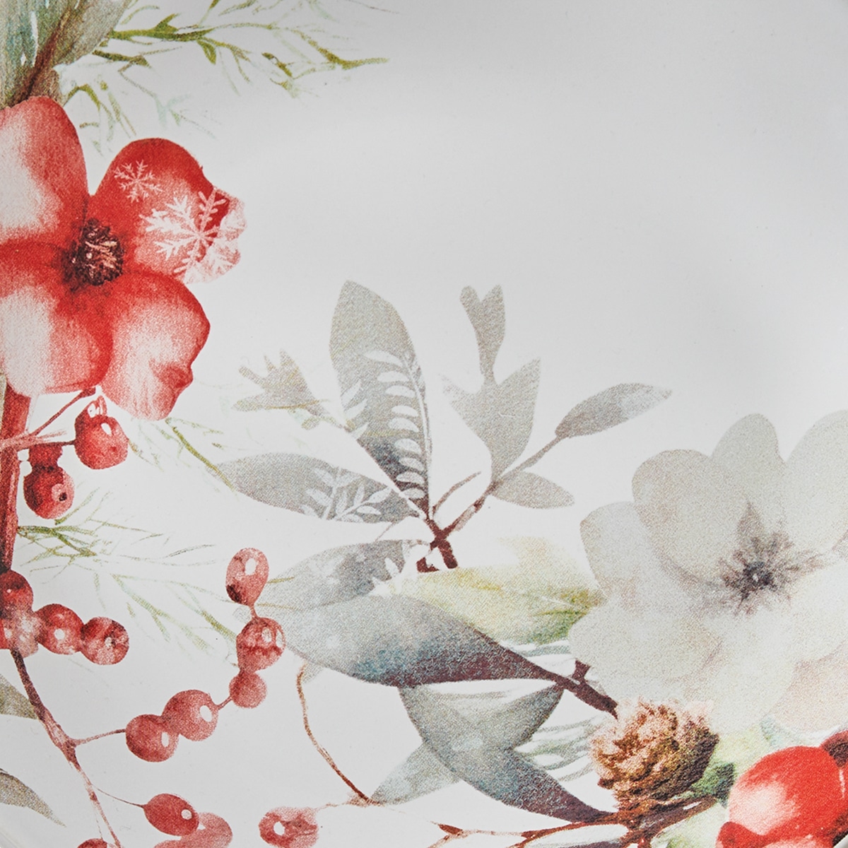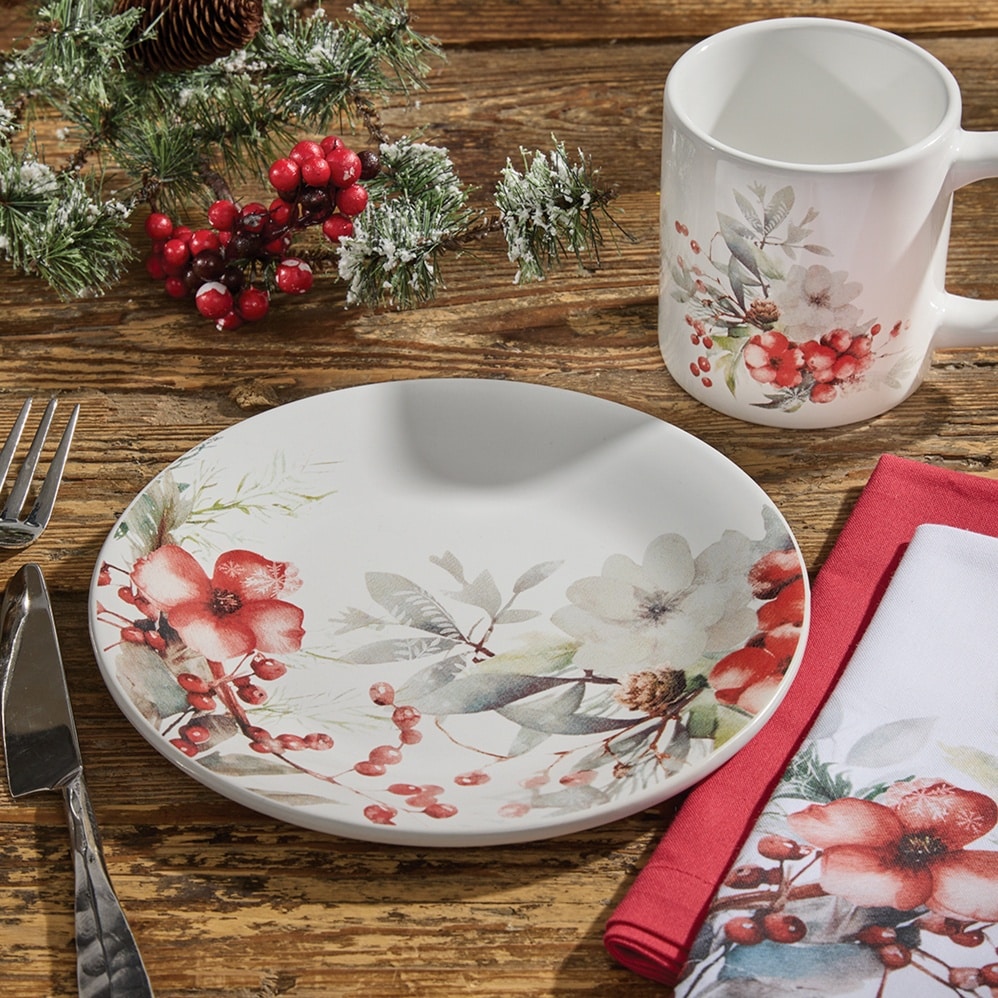 Artfully designed with a border of snow-dusted botanicals, the First Snow Salad Plates bring elegance to smaller portions. Each ceramic plate features a rim design of red cranberry clusters intertwined with green sprigs and soft red floral accents. The watercolor styling and snow-washed fade add a dreamy softness that makes these plates equally suited for rustic or refined tablescapes.