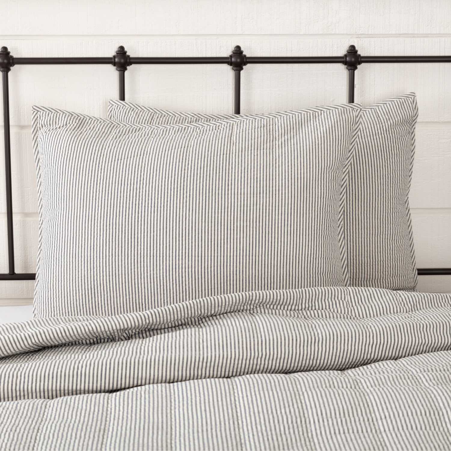 Add vintage charm and breezy farmhouse style to your bedding with the Hatteras Seersucker Blue Ticking Stripe Sham. Featuring classic stripes in denim blue and soft cotton white, this sham is crafted from lightweight, breathable 100% cotton seersucker for a texture that’s as practical as it is pretty. Its puckered weave offers subtle dimension and a soft, relaxed feel—perfect for warm-weather comfort and year-round layering.