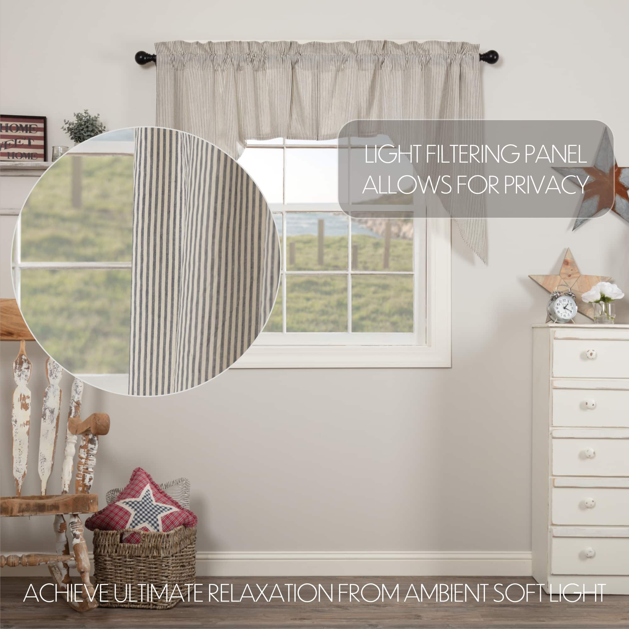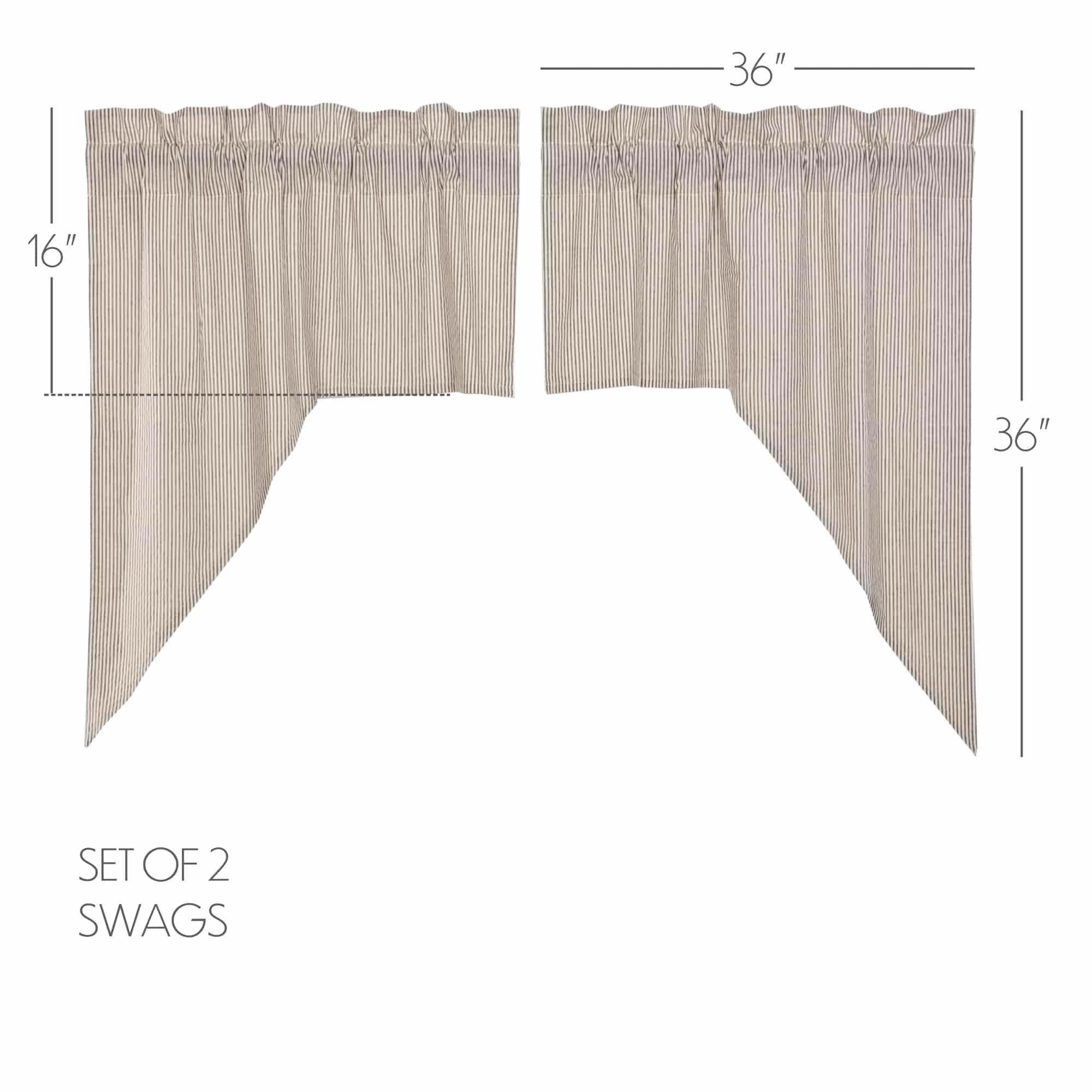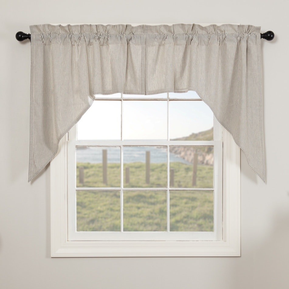 Add a touch of timeless farmhouse charm to your windows with the Hatteras Seersucker Blue Ticking Stripe Swag Set. This set of two swags measures 36″ x 36″ with a 16″ drop and features classic angled drapes that beautifully frame your window while allowing natural light to filter through. Made from soft, breathable cotton seersucker, the fabric showcases a clean denim blue and cotton white ticking stripe pattern for a vintage-inspired, country look.