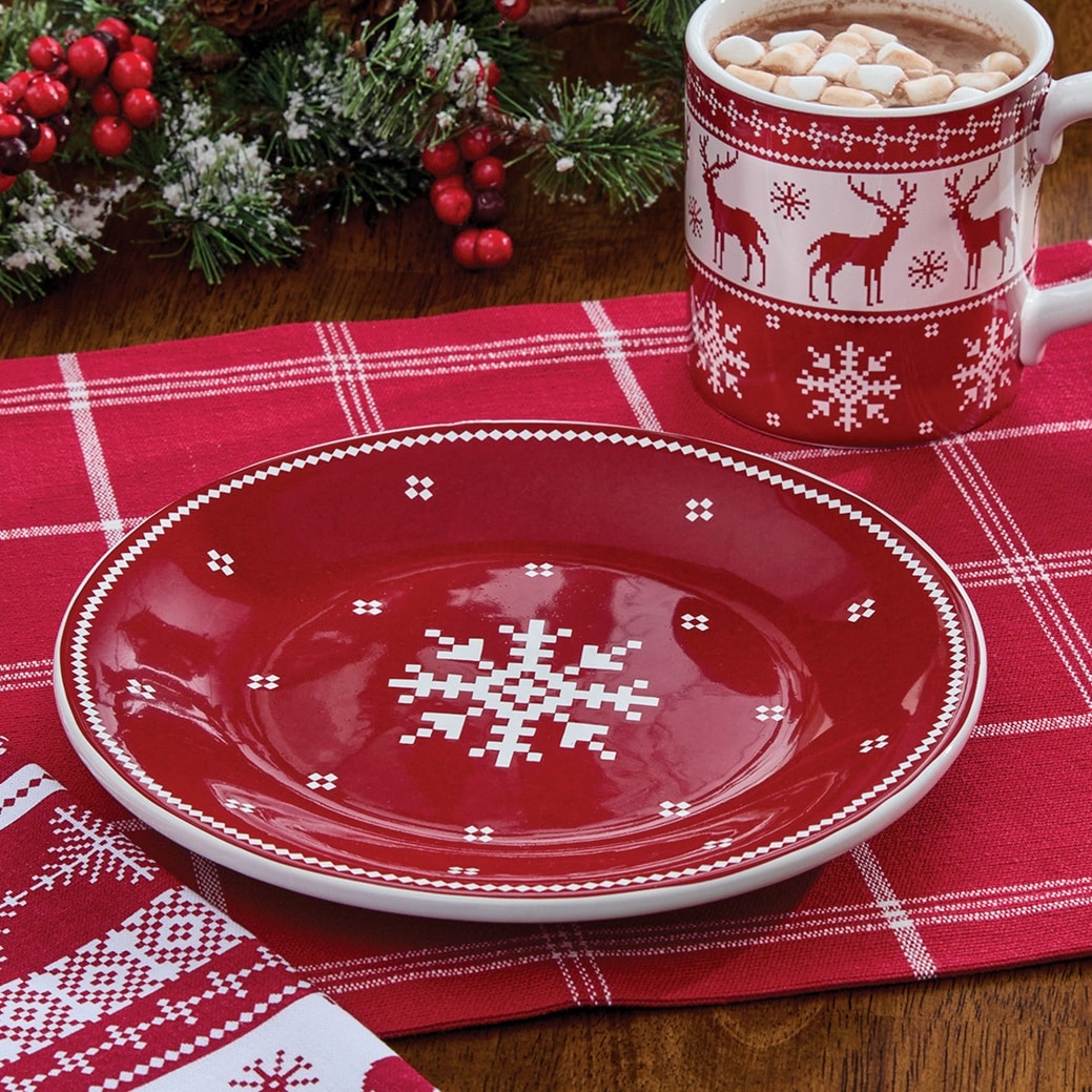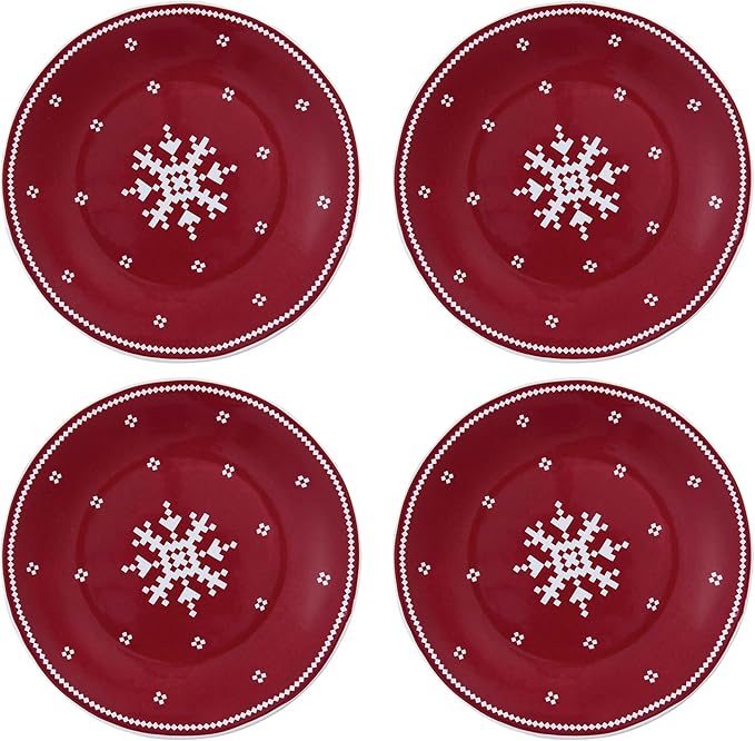 Add a touch of cozy holiday charm to your table with the Fairisle Salad Plates. This set of four features a classic Scandinavian-inspired design by actress and designer Patricia Heaton, with a bold central snowflake surrounded by delicate flurries, all set against a festive Christmas red background. Each plate measures 8.75″ in diameter and is crafted from durable Dolomite, offering both beauty and resilience. The cheerful, wintry pattern brings warmth and tradition to holiday meals, whether you’re hosting a gathering or enjoying a quiet night by the fire.