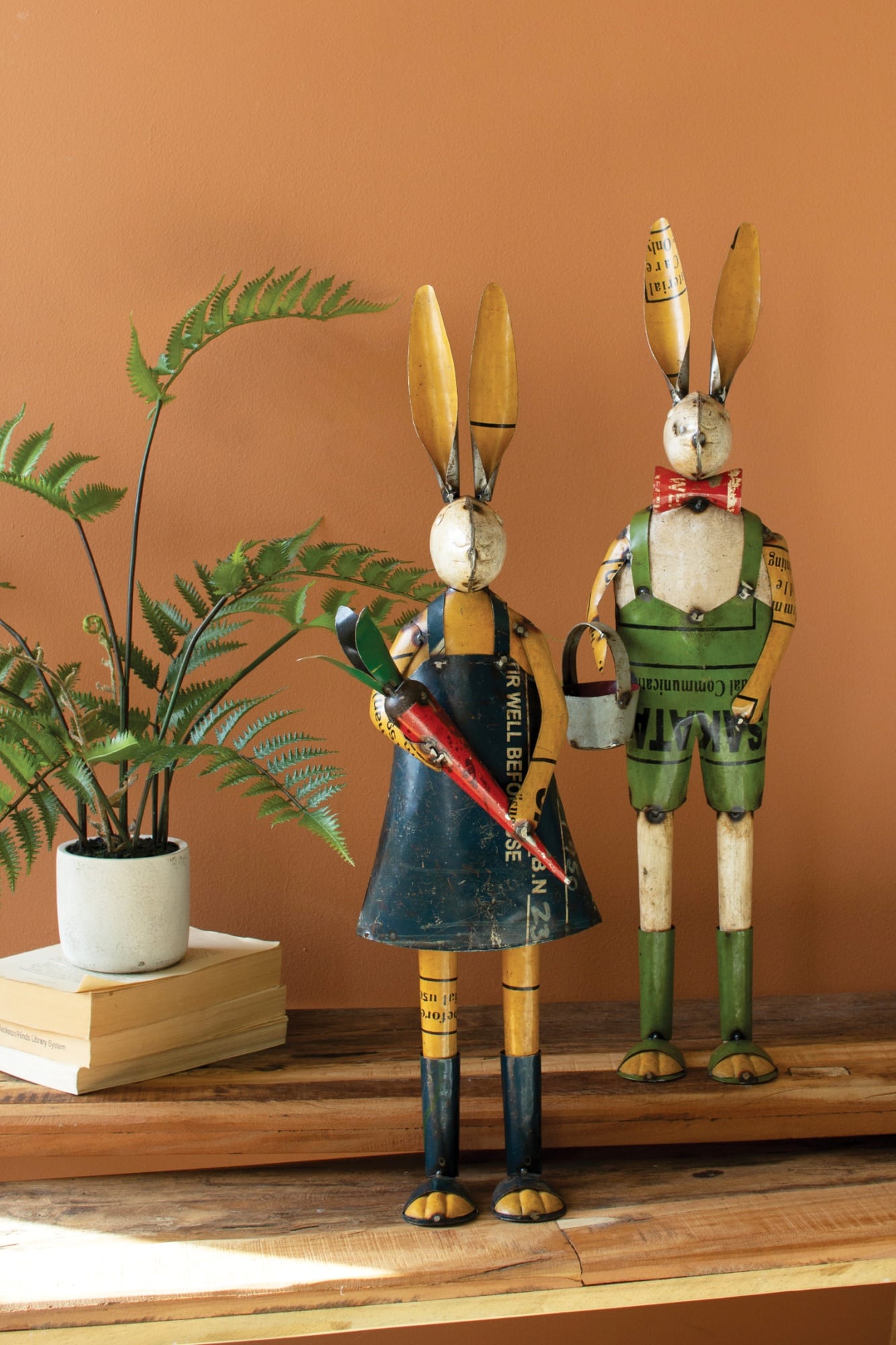 Add a playful charm to your springtime decor with the Hoppy Harvest Duo – a delightful set of two garden-ready rabbits crafted from reclaimed metal. One holds a bucket, the other a carrot, bringing a whimsical touch to Easter decorating or year-round cottage and farmhouse settings. Their hand-crafted appearance, full of rustic character and subtle imperfections, reflects the charm of repurposed materials—making each set beautifully unique.