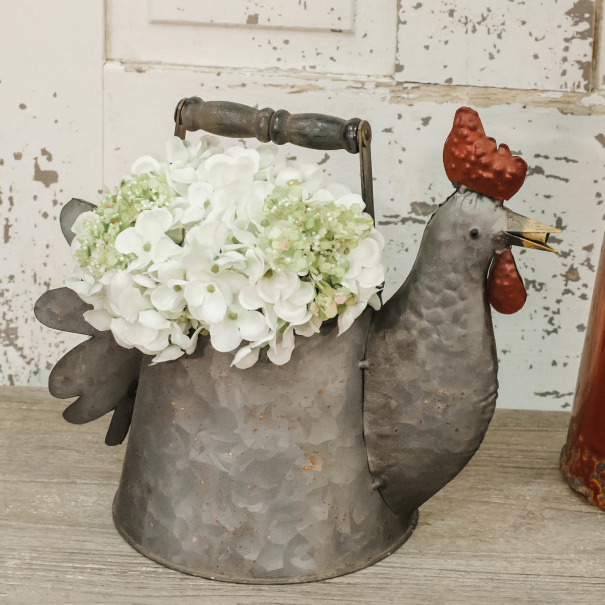 These faux blooms do a wonderful job of imitating a hydrangea in full glory! Gorgeous cream petals with a just a hint of green are accented with brand new buds in brilliant yellow-green tones. The pick is generously covered with clusters of petals on stems that join together to create a full Mophead Hydrangea bloom, measuring 4-5″ across, sure to create a spectacular display in any wall basket, galvanized bucket or watering can. Two Cream picks shown in pitcher.