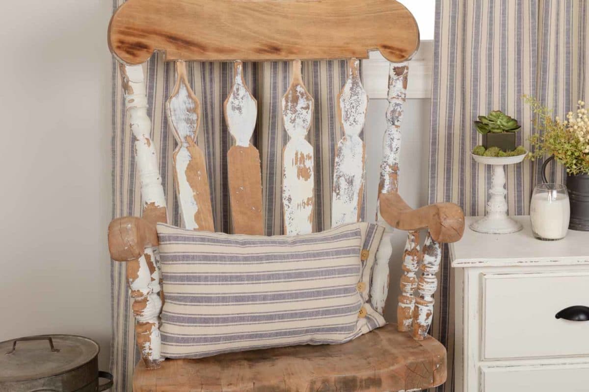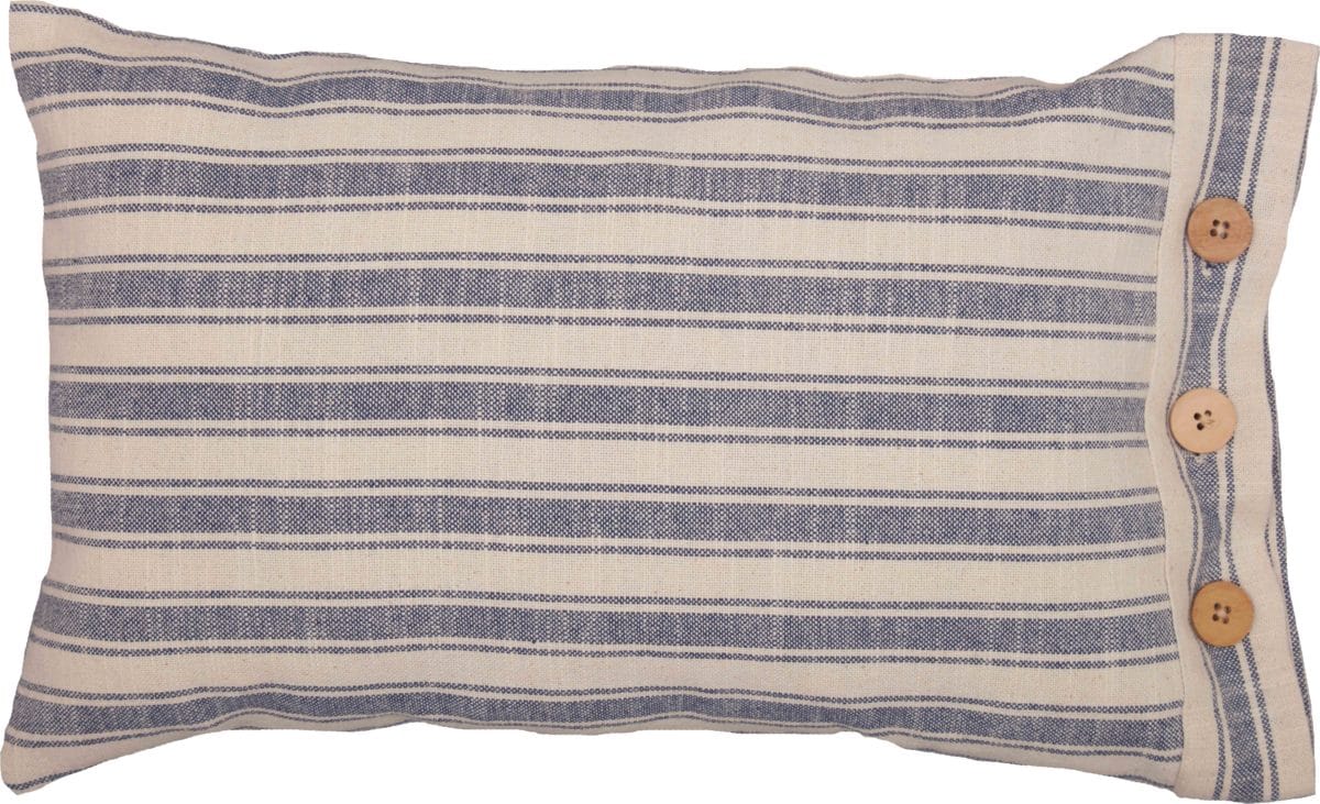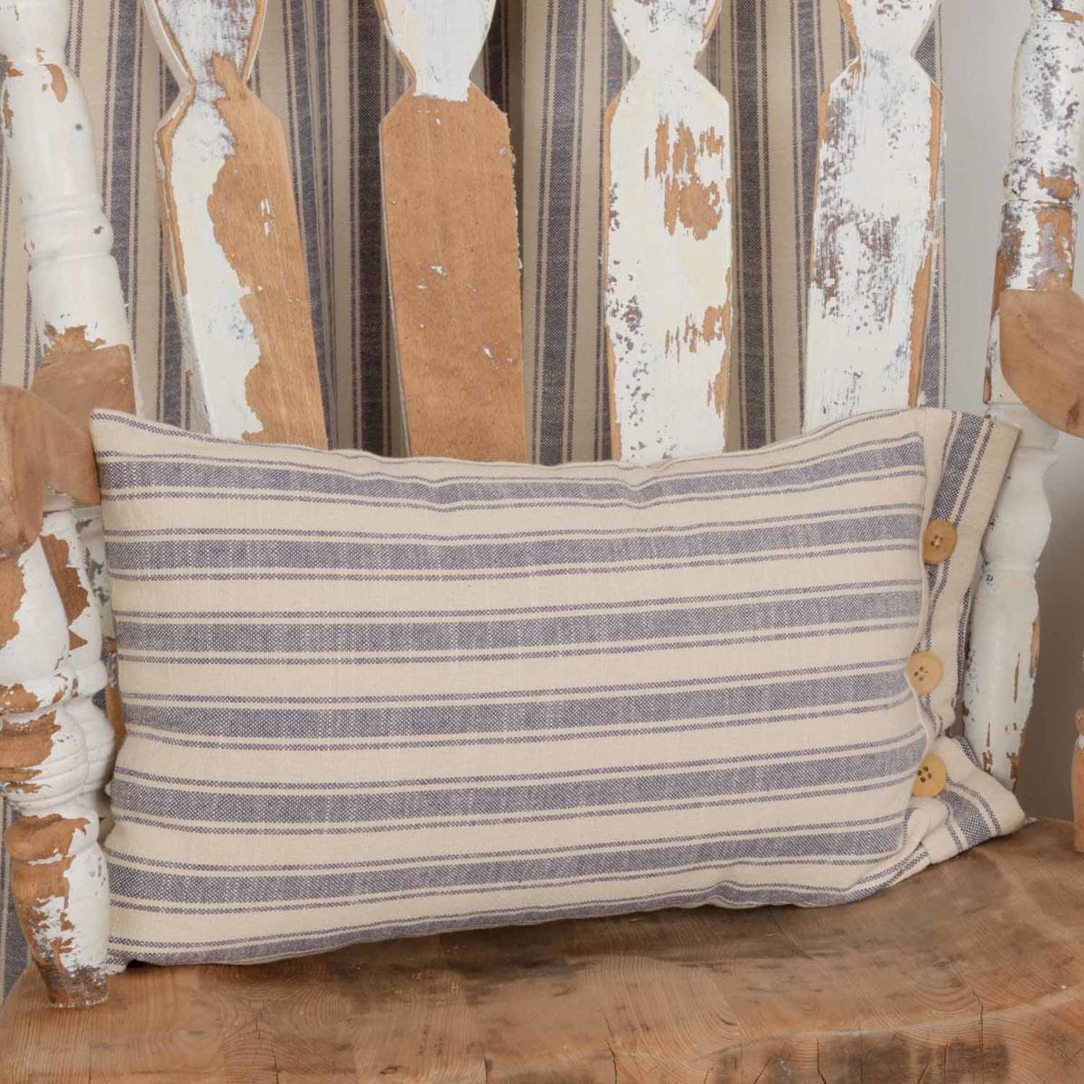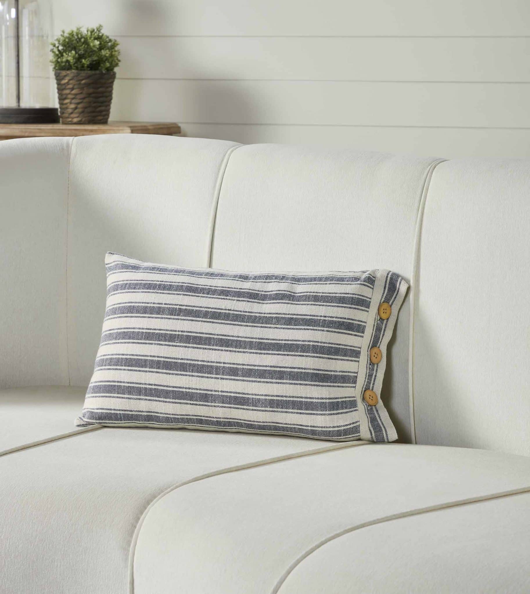 These days, we can’t seem to get enough of ticking stripes and grain sack fabrics, so this collection is one of our all-time favorites! It’s the perfect look for a fresh farmhouse-style home. We chose a beautifully textured cotton fabric with a substantial weight and a soft touch for the Market Place fabrics. The woven ticking stripes in denim blue make a striking contrast to the natural cream base. Two coordinating fabric options in the Market Place Collection offer an easy mix-and-match solution. This lumbar-sized pillow features a wide ticking stripe fabric in blue and cream, fabric reverses to the same on the back. The ticking stripe changes direction on the end and features the addition of 3 buttons for a decorative detail, which also serves the purpose of enclosing the pillow fill. Pillow Cover only.