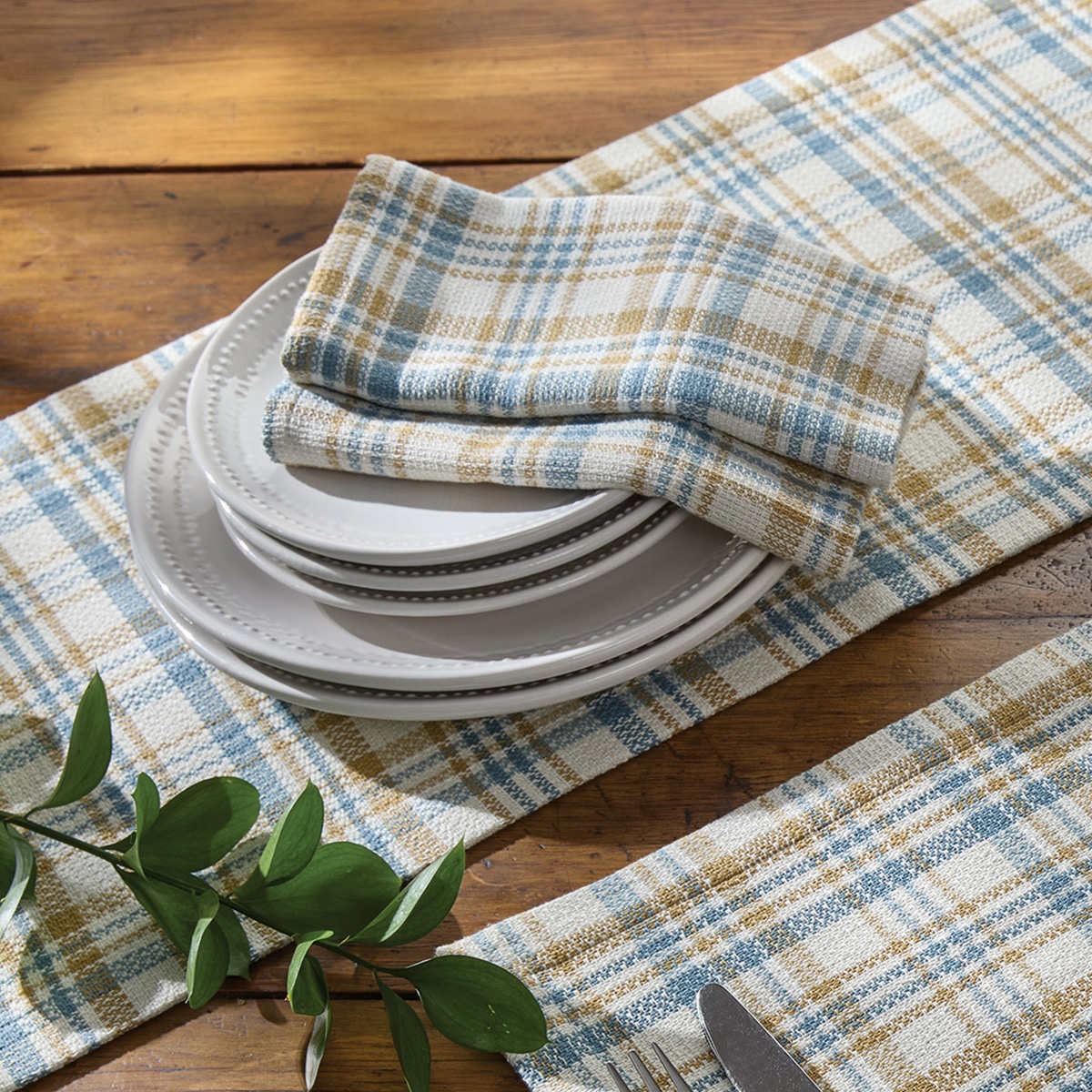 Bring timeless charm to your table with the Newton Table Runner, featuring a classic plaid pattern in warm, inviting hues. Soft shades of sky blue and golden wheat weave together on a rich, warm oatmeal backdrop, creating a look that’s both relaxed and refined.