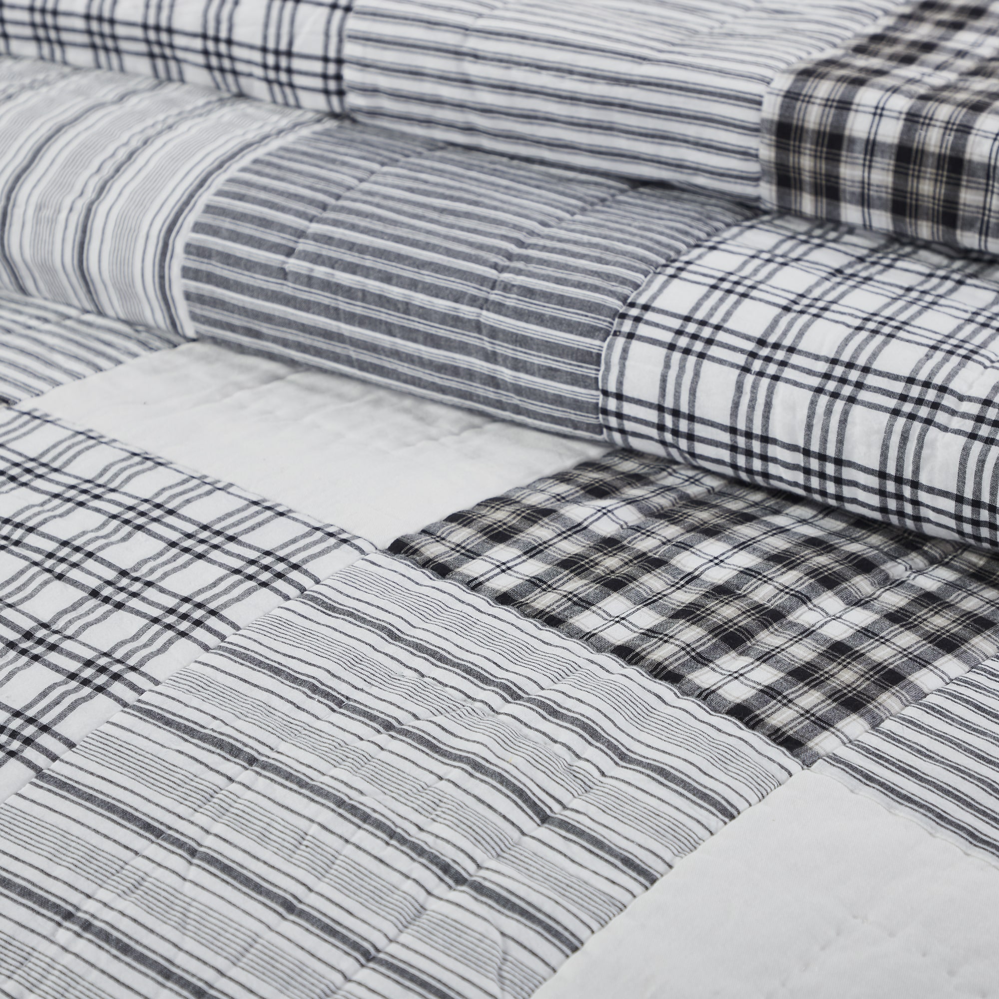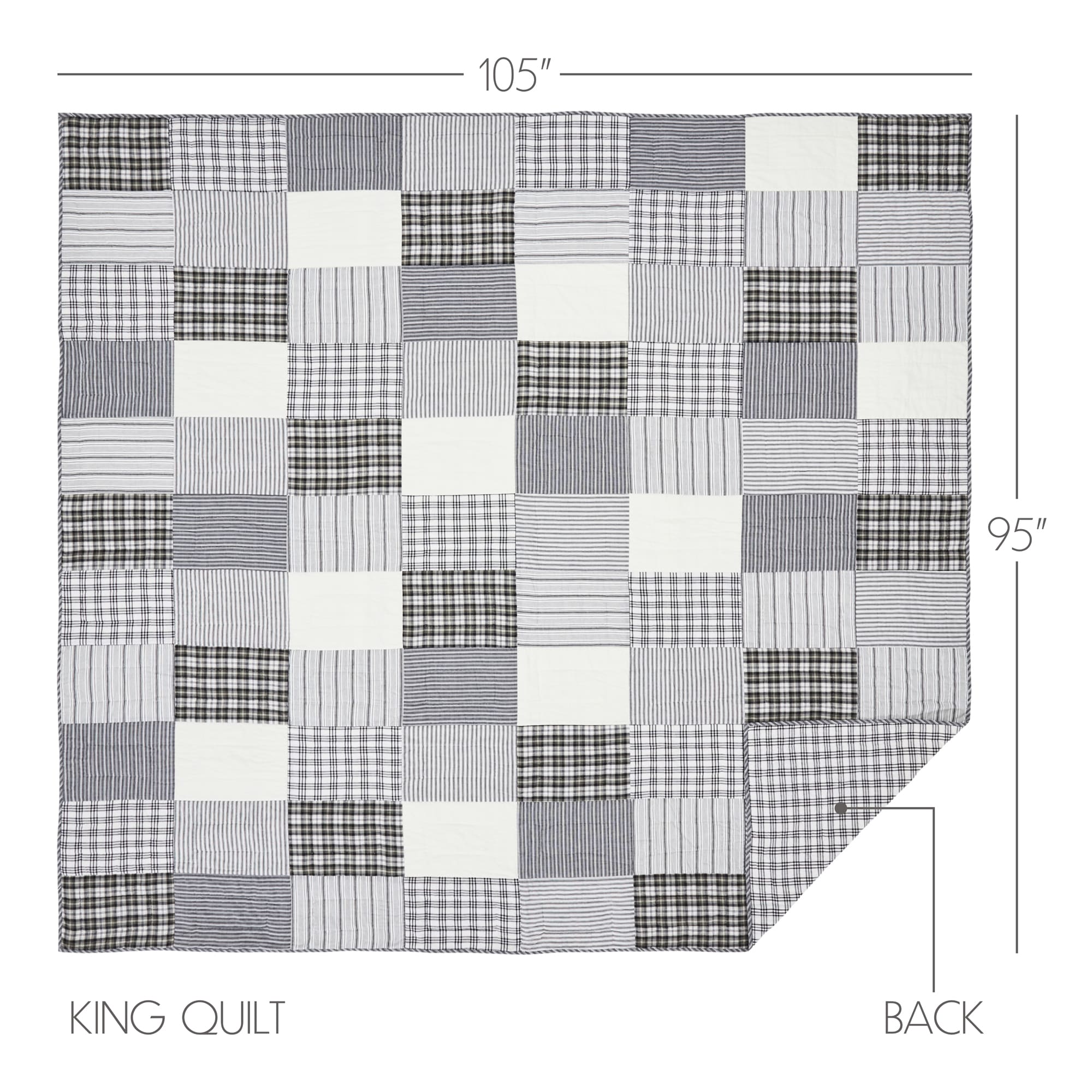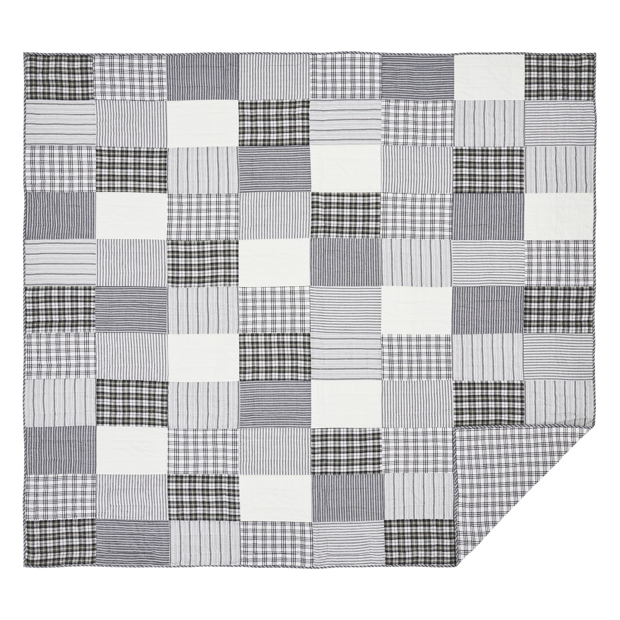 Capture the feel of a modern farmhouse or cottage-style decor with this classic patchwork quilt in simple black and white patterns. The Sawyer Mill Black Quilt features is hand-quilted and machine pieced, featuring echo quilting and stitch-in-the-ditch accents for a superior finish built to last. A simple and stylish black and white patchwork in a mix of plaids and classic farmhouse stripes creates a clean, modern appearance. Reverses to a simple black and white windowpane plaid. Our Sawyer Mill Black Quilts are made of 100% cotton shell and batting. The genuine patchwork layout brings a hand-crafted feel to the home. Coordinates with the Sawyer Mill Black Collection for a complete modern farmhouse look for your room.