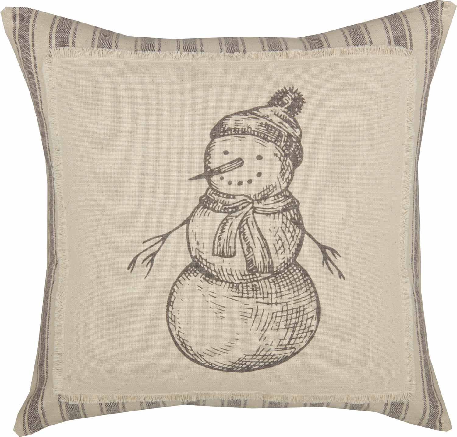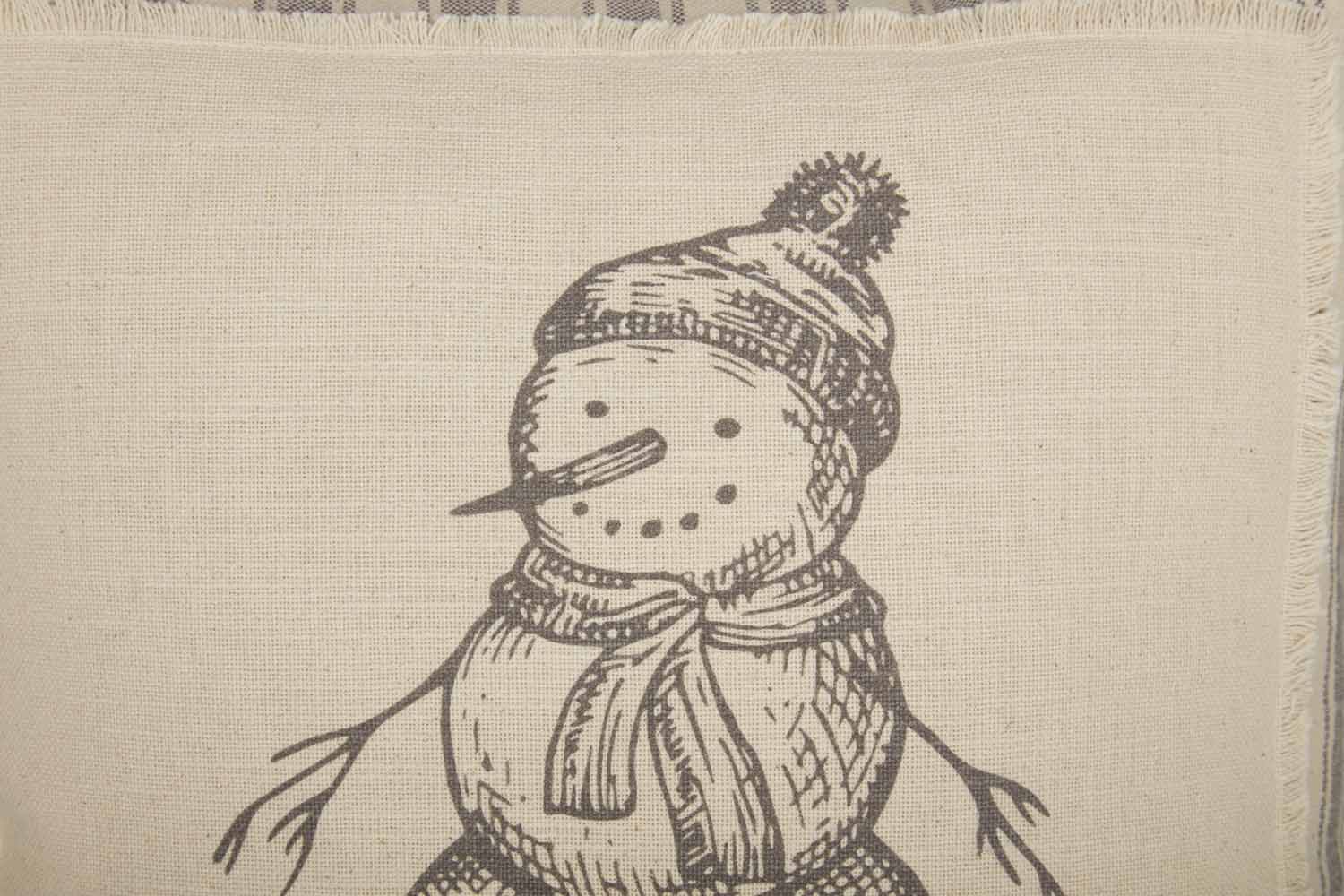 The Sketched Snowman Pillow Cover adds a sweet, neutral layer to your farmhouse displays this holiday. A soft creamy applique patch with unfinished edges is the perfect canvas for the understated gray-sketched snowman with the big happy smile. Casual, relaxed Christmas style is what this pillow cover brings to every setting. The entire cover is a gray ticking fabric (Market Place Gray) which forms a lovely frame around the appliqued patch. The same fabric dresses up the back of the pillow and 2 natural tone wooden buttons keep your insert secure. (1 extra button sewn into the cover, just in case.)