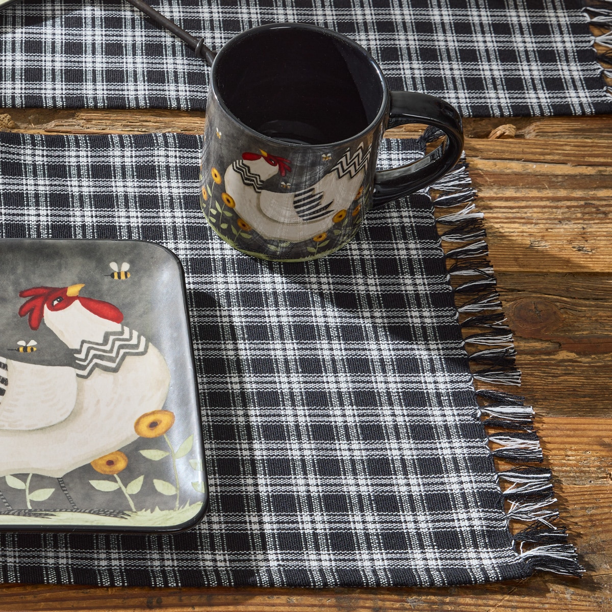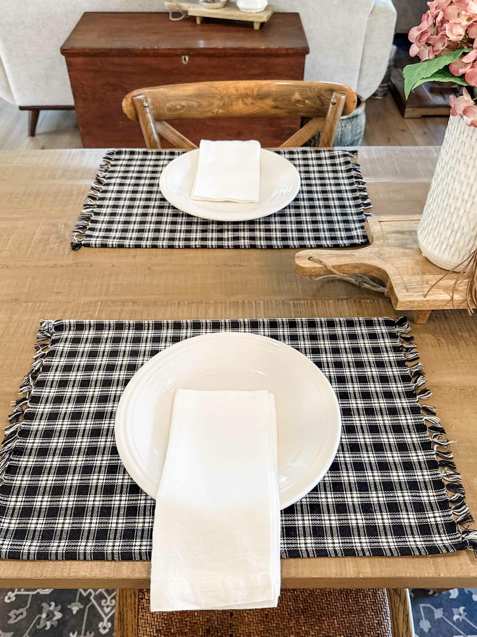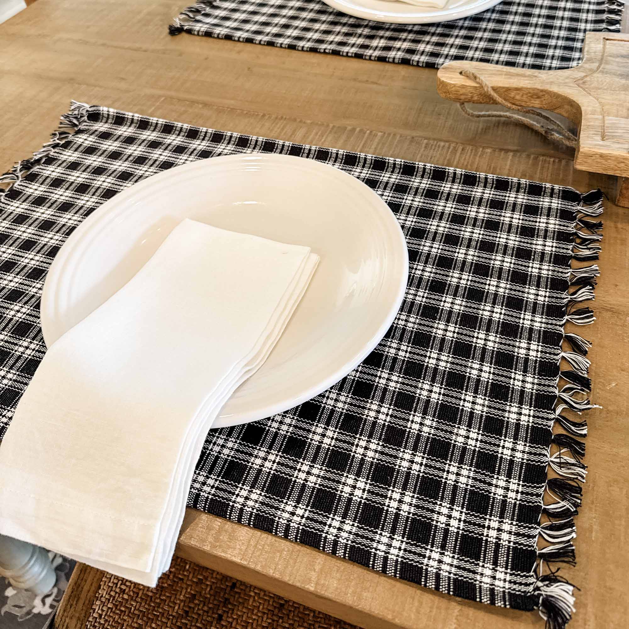 Make a bold, tailored statement with the Stafford Black & Cream Placemats. This set of four features a crisp black and cream plaid that brings modern farmhouse style to any table. Finished with soft fringe on the ends, these placemats add texture and charm to your setting. Made from soft, durable cotton, they offer both function and flair—perfect for everything from casual breakfasts to dinner parties. Sold as a Set/4