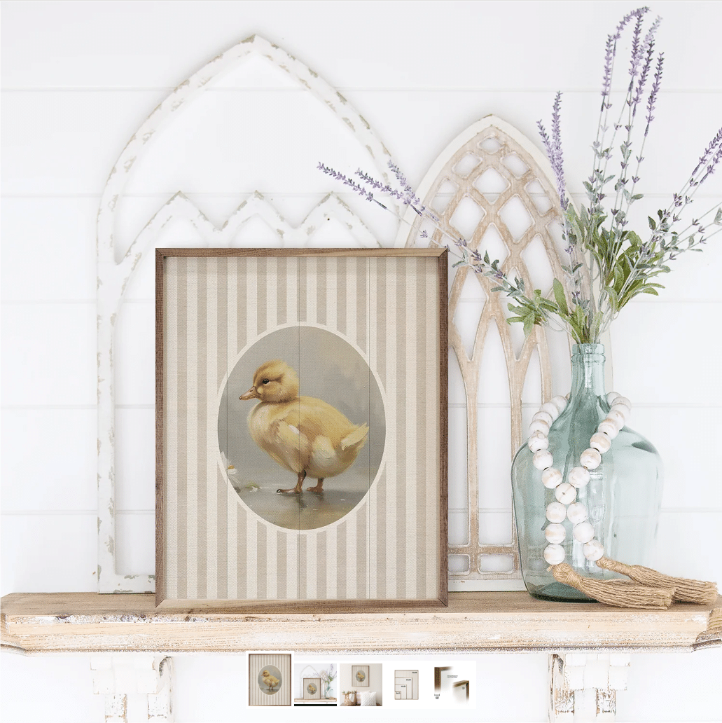 Add a touch of sweet, vintage charm to your home with the Stripes & Duckling Wooden Sign. Featuring a softly painted yellow duckling nestled within an oval frame, this sign exudes warmth and nostalgia. The subtle beige and cream stripe background enhances its classic appeal, while the wood plank texture gives it a handcrafted look. This beautifully framed piece is perfect for a nursery, farmhouse kitchen, or spring-inspired décor. Whether displayed on a wall or propped up on a shelf, this darling duckling brings a gentle, timeless beauty to any space! Signs are made to order.