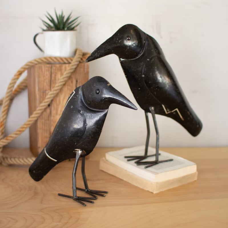 Your spooky decorations will be lacking nevermore with The Gourd Guardians watching over your fall display. This set of two antique black iron crows, crafted from recycled metal, brings a clever nod to classic lore and a rustic edge to your seasonal décor.