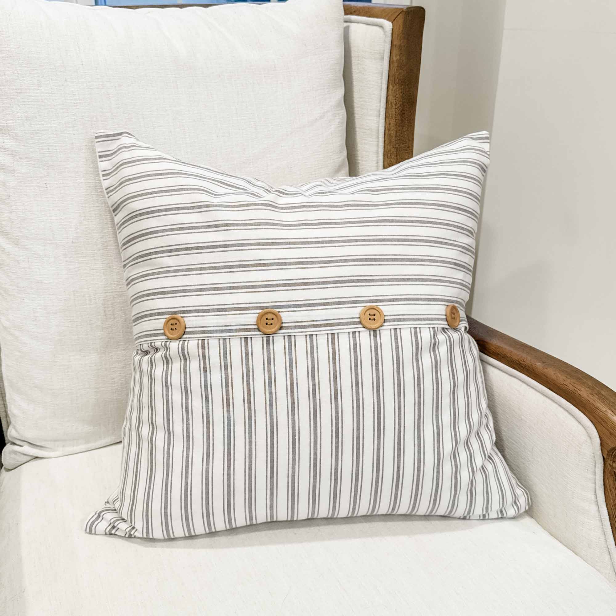 Nothing says farmhouse chic quite so well as the perfectly tailored stripes of our Timeless Ticking fabric. In this classic pattern, one stripe is flanked by thinner stripes on either side, “feathering” out the look, to create a delicate and pleasing fade. Dove Gray combines with restful, creamy white in a familiar repeating design that is visually calming and relaxed. Nonstop farmhouse style is easily achieved when you bring home this unique pillow cover with its interesting, dynamic design. Horizontal stripes meet vertical in a striking pattern, accented with four natural-tone wooden buttons. The pillow cover reverses to Timeless Ticking fabric in a simple design of perfectly tailored stripes and no buttons. A hidden zipper provides closure for the insert of your choice, as the wooden buttons are purely decorative.