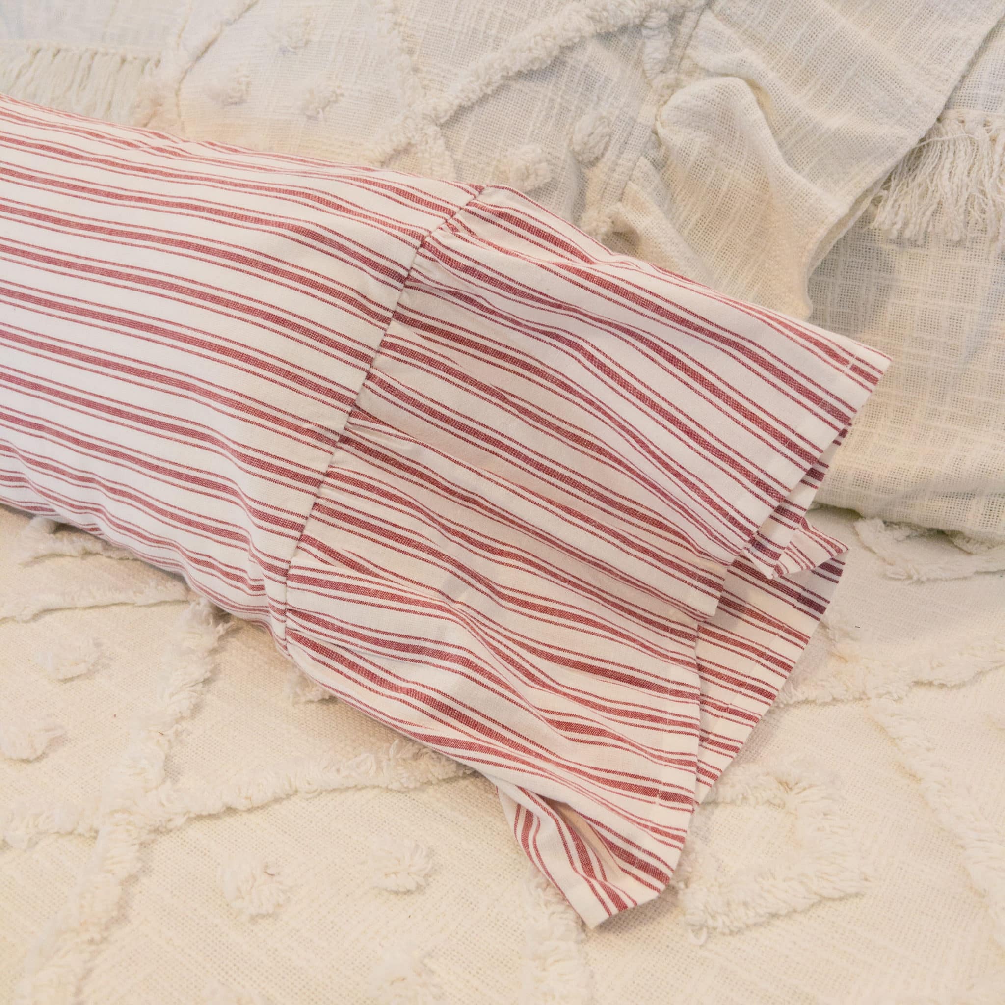 Nothing says farmhouse chic quite so clearly as the perfectly tailored stripes of our Timeless Ticking fabric. In this classic design, one main stripe is flanked by thinner stripes, “feathering” the look in a softly tailored style. True red combines with creamy white in a classic striped pattern that brings vintage good looks. Softness abounds with this playful, flirty Ruffled Pillow cover, adding no end of stylish charm to your rustic farmhouse or upscale cottage. Double ruffles in a generous length ( 8″!!) offer feminine appeal and a romantic touch in layers of fabric that dress up two sides of the pillow cover. The accent reverses to the same fabric adding to the life and durability of the cover. A simple opening, without a zipper or buttons, on one side provides room for your insert.