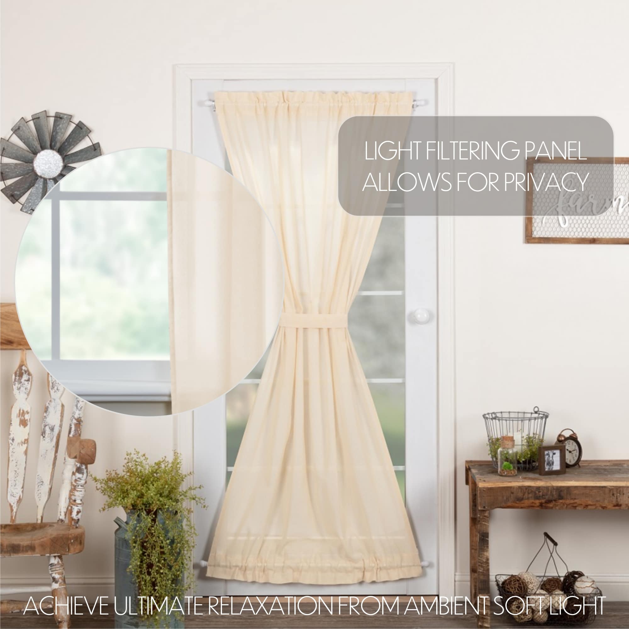 Add understated elegance and soft farmhouse charm to your space with the Tobacco Cloth Natural Door Panel. This panel features a sheer, unlined tobacco cloth fabric in a warm natural tone. The loosely woven texture offers a light, airy feel—similar to gauze or cheesecloth—allowing natural light to filter through while still offering a touch of privacy. Delicate fringed edging adds a relaxed, vintage appeal, and the built-in rod pocket ensures easy installation and a secure fit. A matching tieback is included, allowing you to style the panel open or closed depending on your preference. Ideal for cottage-inspired or country farmhouse interiors, this door panel adds texture, softness, and charm without overwhelming your space. Dry clean for best results and to prevent shrinkage or Spot clean and lay flat to dry. Iron Safe.