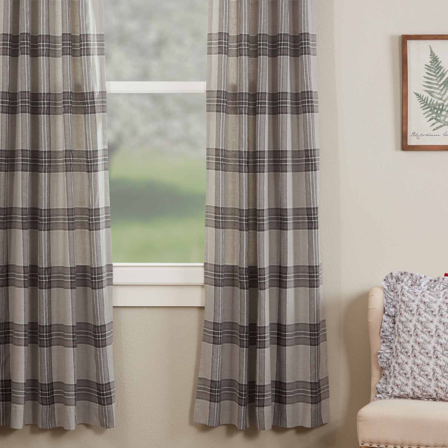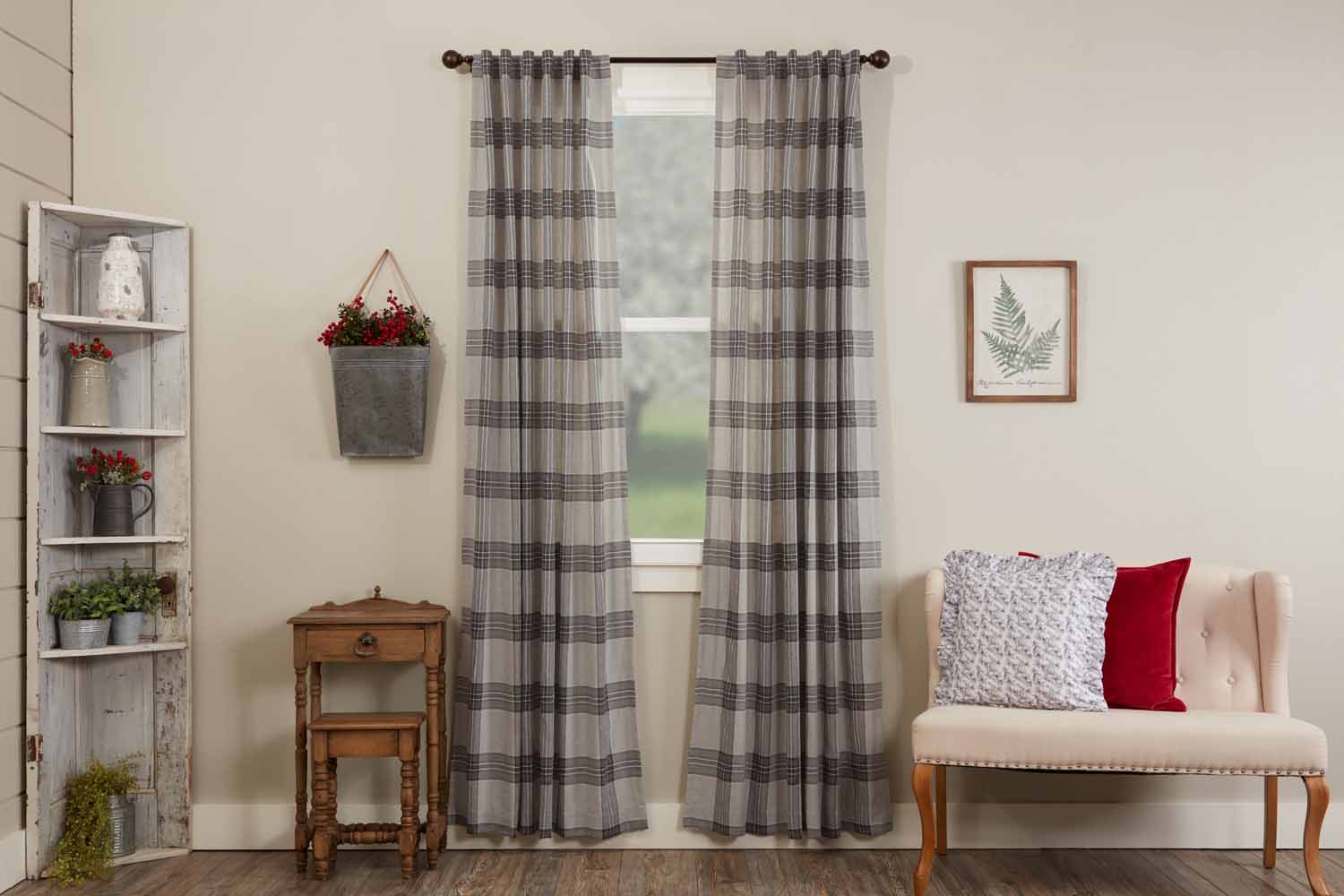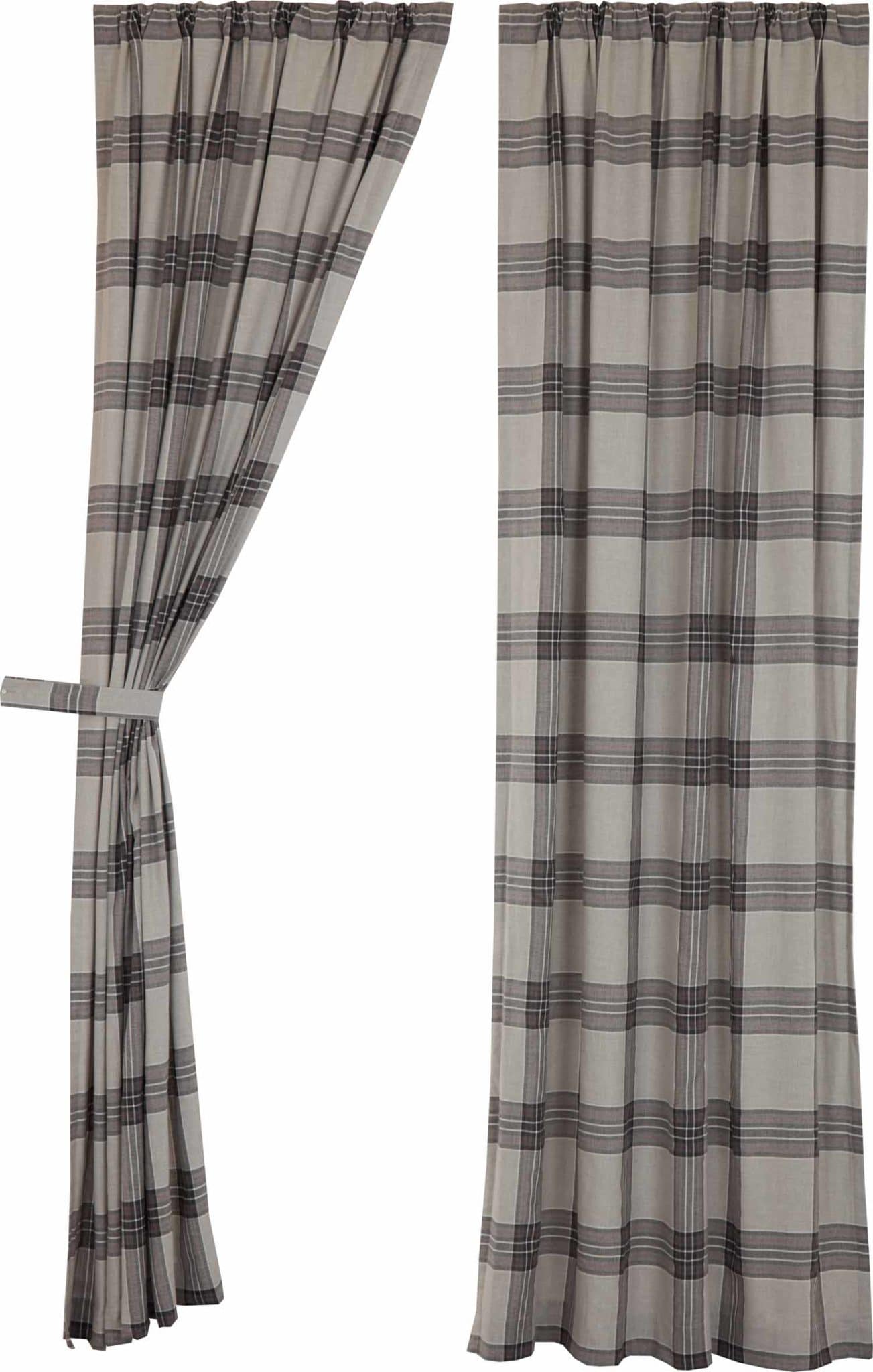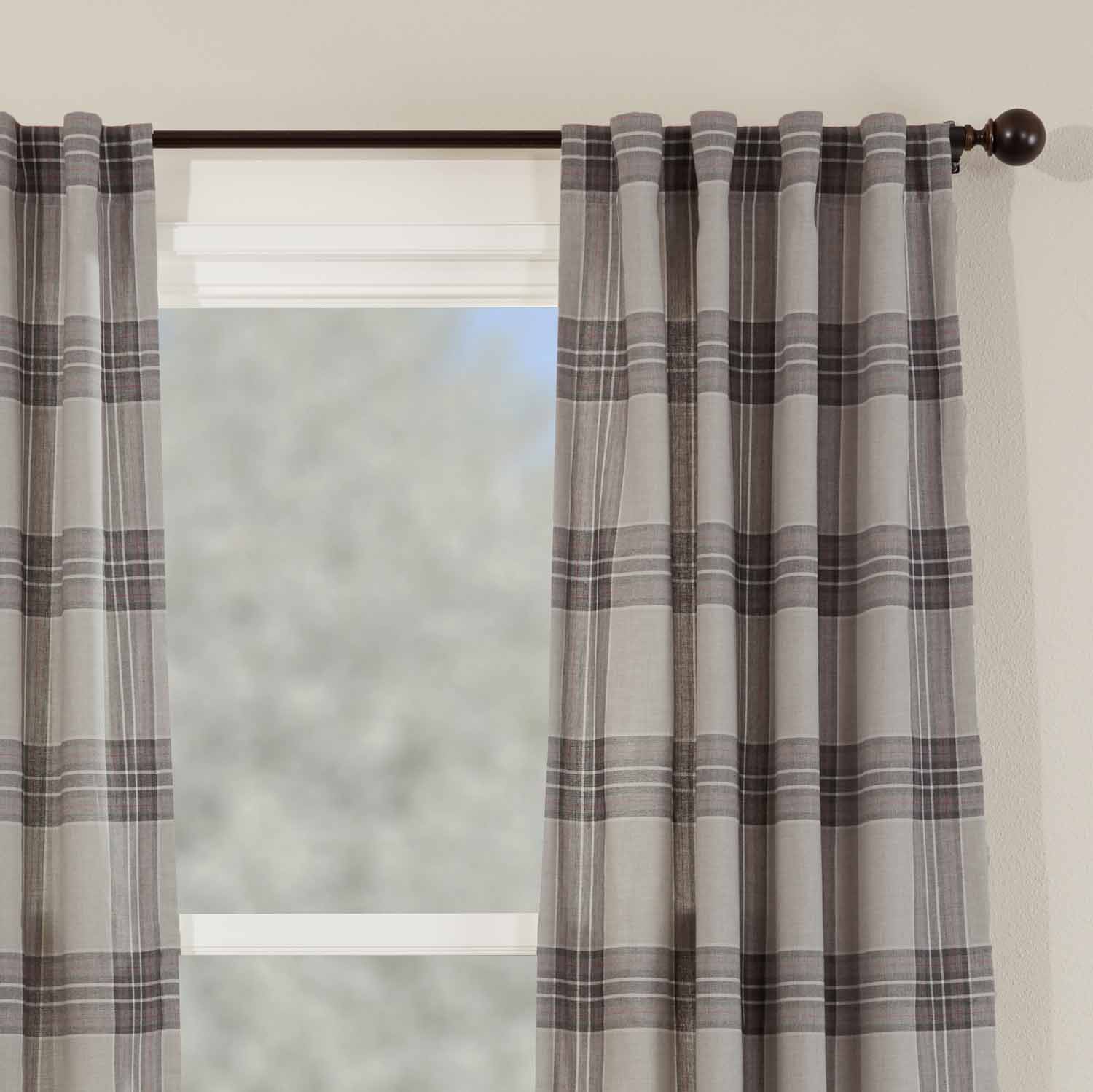 The Twilight Plaid Collection features a stylish, timeless pattern of smoky gray blocks accented with rich charcoal and red stripes. The plaid brings a comforting symmetry and tailored, geometric design that adds refined class to your farmhouse windows. Simple lines and rich, dark tones define the curtains with an eye-pleasing balance and bold look, bringing the perfect update to your home. The plaid fabric and cotton lining add soft layers that filter bright sunlight and provide substantial privacy. The curtains have no header, keeping the look modern and clean, and back tabs and a rod pocket offer two different display options. Two matching tiebacks are provided enabling you to gather and drape the panels if you prefer a softer touch. Set/2.