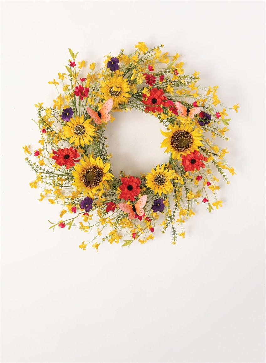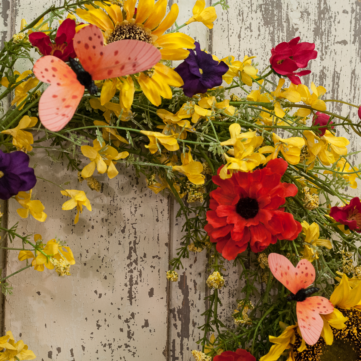 Like a country meadow bursting with flowers in rich, dazzling colors, the Wildflower Mix Wreath is sure to add a bright and cheerful vibe to any space. Artfully arranged with intense tones which contrast brilliantly, this accent will lift the spirits of everyone who sees it! Lifelike foliage in different shades and textures adds to the realistic, multi-dimensional look. The wreath is a real show-stopper, bringing a magnificent focus to a door or mirror, or perhaps taking center stage on a gallery wall display. The Wildflower Wreath is not only esthetically pleasing in every way, it will not droop or drop a petal through the entire season, making it a favorite design element in your home for years to come.